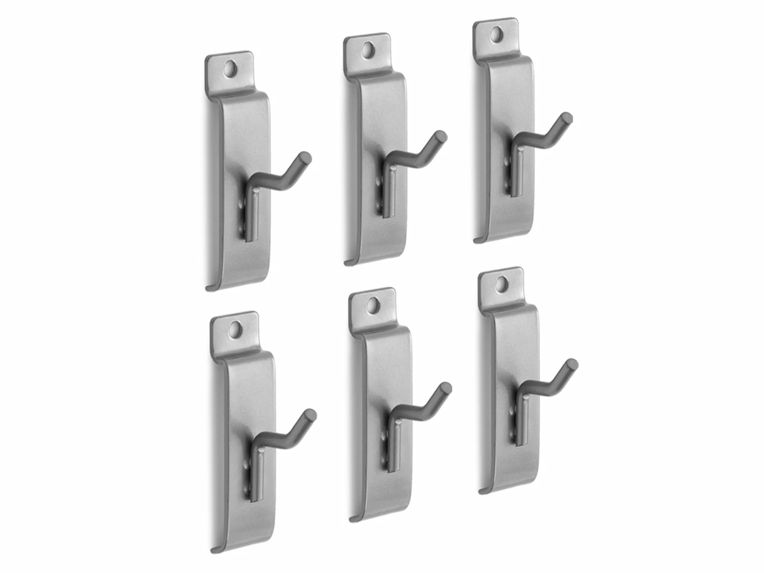 Maximize your slatwall system with NewAge Products Slatwall Accessories. Designed for use with NewAge Products Steel and PVC Slatwall systems, and compatible with most 3 in. on-center slatwall systems, our snap-in Slatwall Accessories are built with steel for extra strength. The powder-coat silver gloss finish looks great in any space and on both silver and black slatwall solutions. The 2 in. Single Hooks offer storage for a wide range of smaller items from wrenches to tennis racquets.