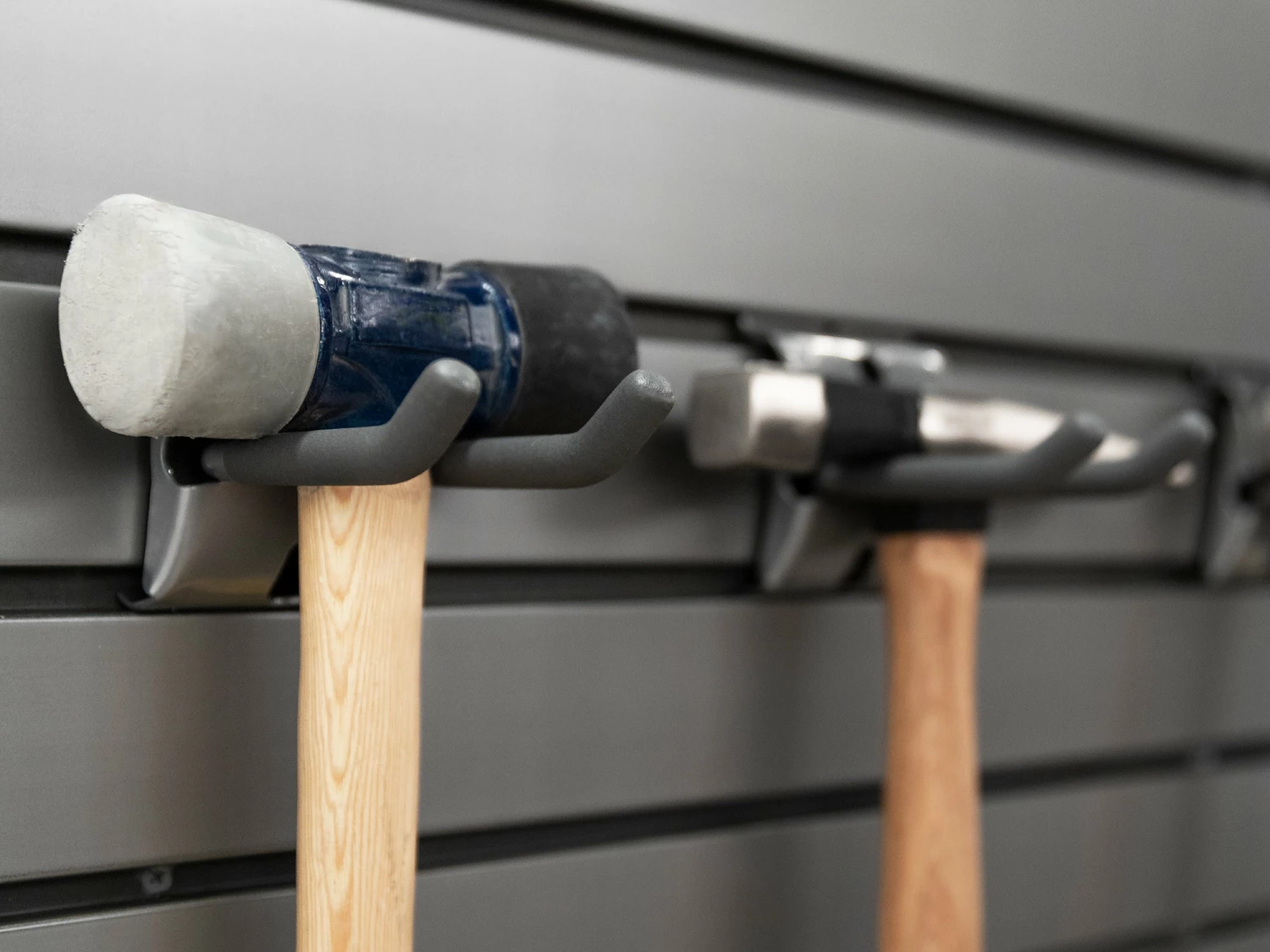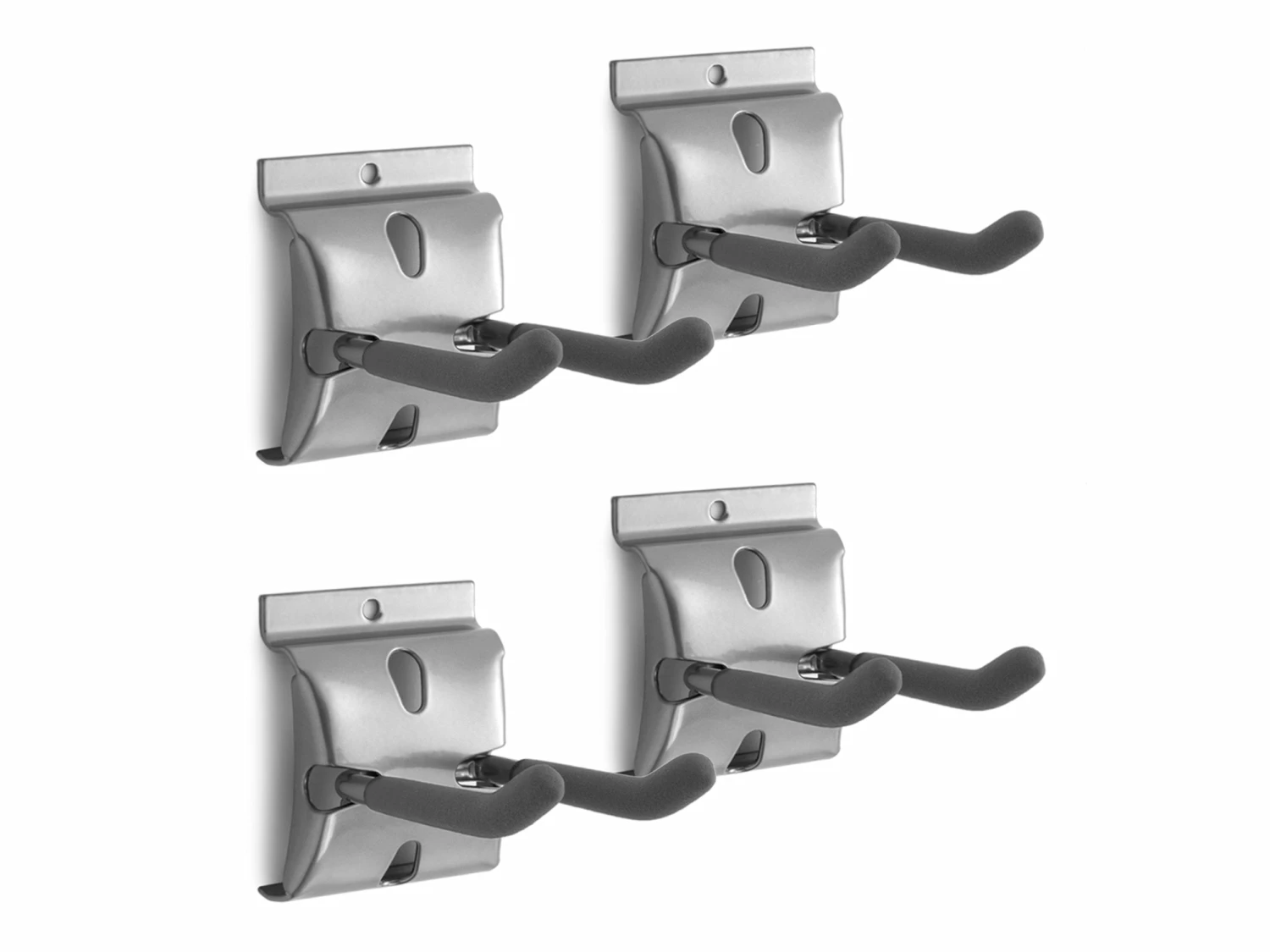 Maximize your slatwall system with NewAge Products Slatwall Accessories. Designed for use with NewAge Products Steel and PVC Slatwall systems, and compatible with most 3 in. on-center slatwall systems, our snap-in Slatwall Accessories are built with steel for extra strength. The powder-coat silver gloss finish looks great in any space and on both silver and black slatwall solutions. The 4 in. Double Hooks feature a protective rubber sleeve that helps prevent sliding and damage to ladders, rakes, oars, bats, and other bulky items.