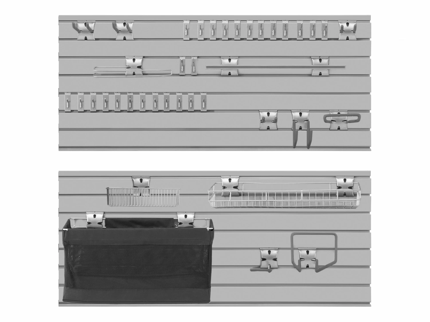 Accessorize your cabinet set for even more functionality, with two 48 in. High-Gloss Silver Slatwall Backsplashes, and a 40-Piece Accessory Kit. Built with high-strength steel for a superior look and feel, the Slatwall Backsplash visually takes your cabinet set to the next level, while offering an easy-to-clean backing for your workspace. Precision fit for use with NewAge Products Bold Series 3.0 and Performance Series 2.0 cabinets, each of the 48 in. Slatwall Backsplashes spans perfectly across two base cabinets, fitting snugly between your worktop and wall cabinets. Hidden fasteners allow for a quick installation and cover the screw holes for a seamless, streamlined finish. A magnetic finishing strip easily snaps to the top panel to complete the flawless look. The high-gloss powder coat paint finish protects from rust, and is easily wiped clean of dirt, dust and oil. Add more utility to your workspace, with the NewAge Products 40-Piece Steel Slatwall Accessory Kit for storing all of your odds and ends.