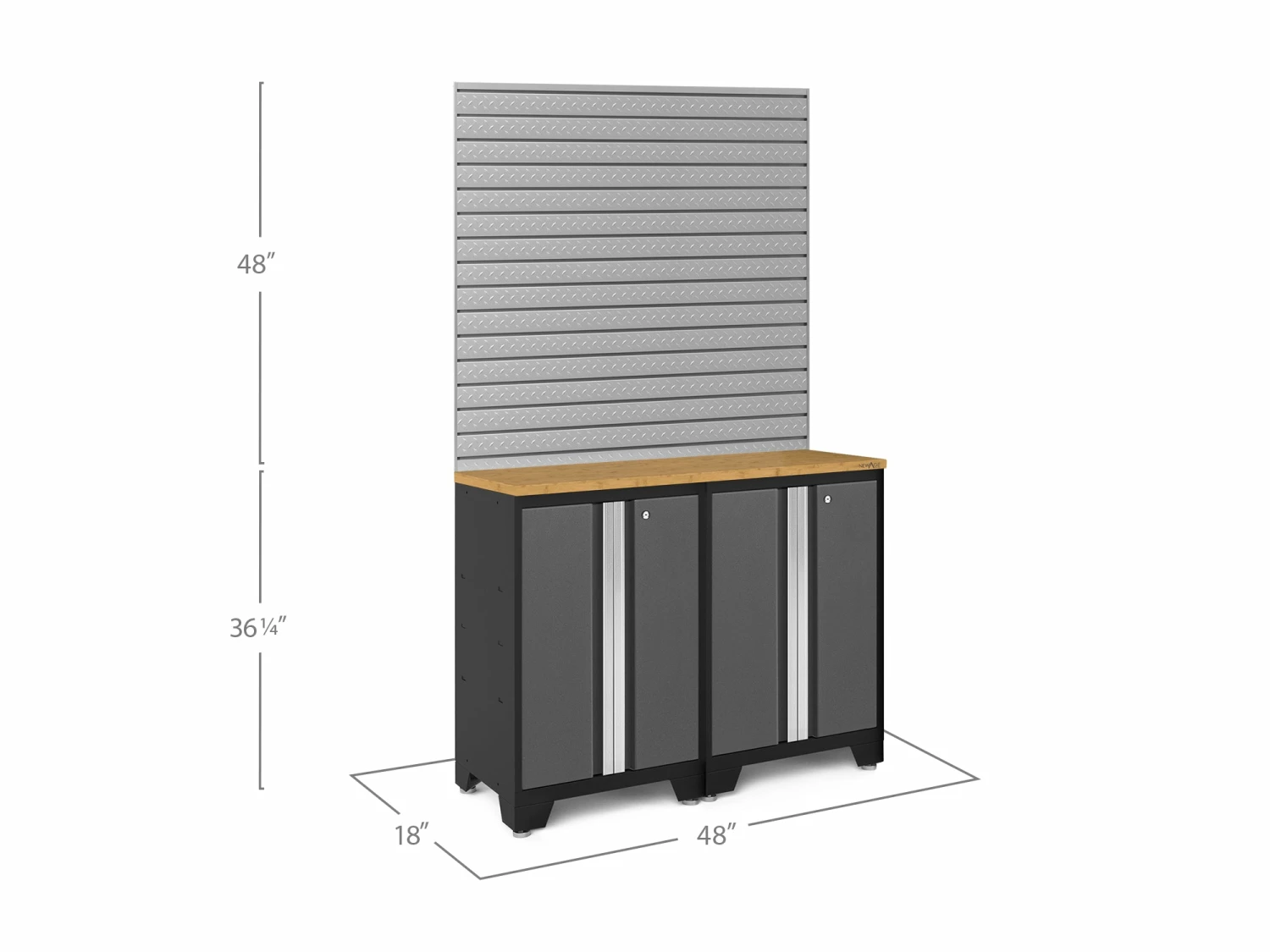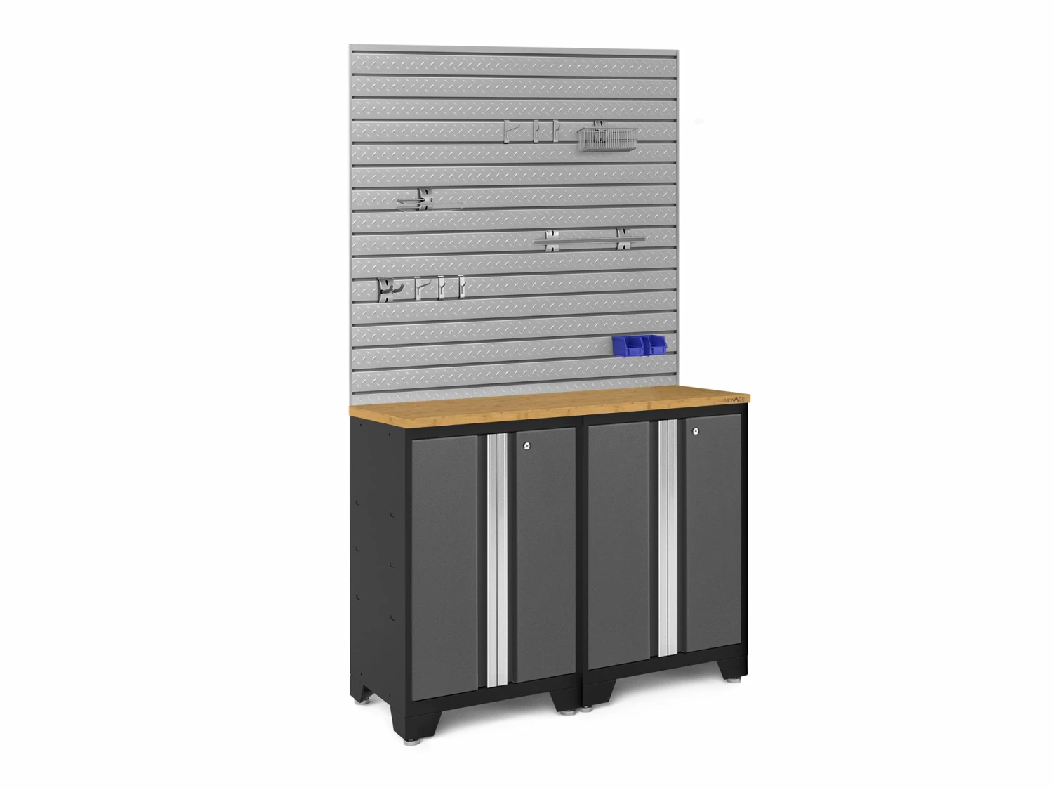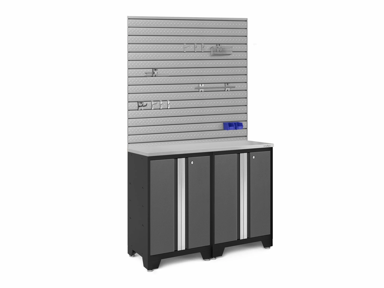 Upgrade the look and organization of your garage with Bold Series 3.0 Cabinetry. Built with heavy-duty steel frames for extra-strength, these cabinets are ideal for storing sports equipment, seasonal decor and tools. The powder-coat paint finish gives protection against scratches and rusting, making the cabinets perfect for rugged use. Full-length aluminum handles let you easily access your gear, with lockable doors to keep items secure. Full-extension drawers and adjustable shelves give you the customizable space to store items of all sizes. The diamond plate pattern Slatwall Kit includes two 2 ft. x 4 ft. panels that can be installed vertically for a stacked wall configuration, horizontally for a long length of tool storage, or on separate walls for area-specific organization. The Steel Slatwall Accessory Kit includes baskets, hooks, and utility components. Get organized and improve the functionality of your garage, with a Bold Series 3.0 Cabinet System.