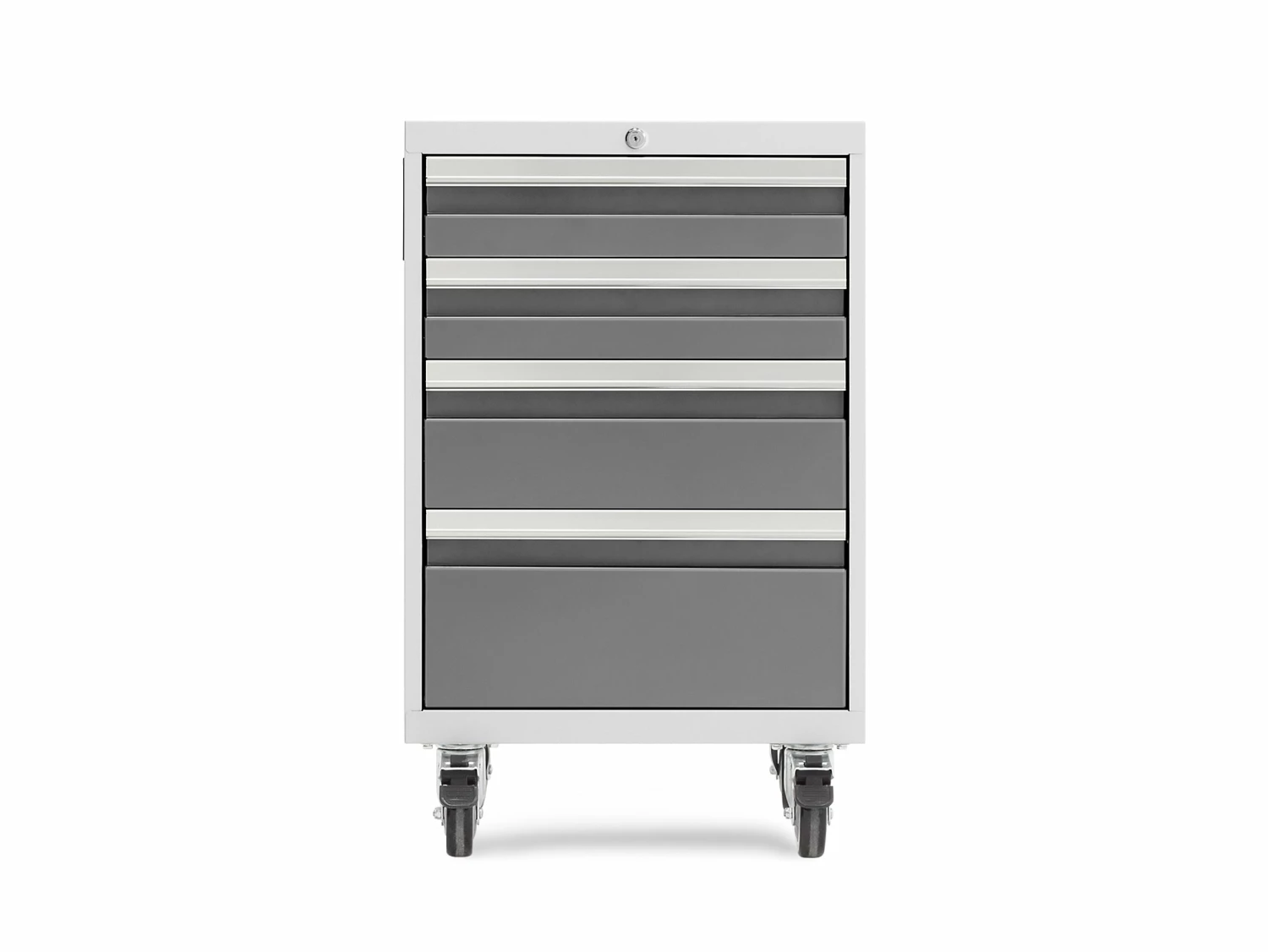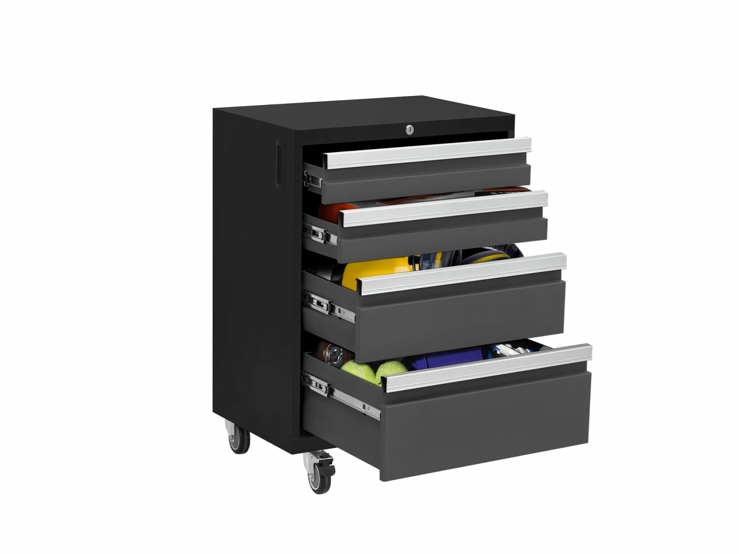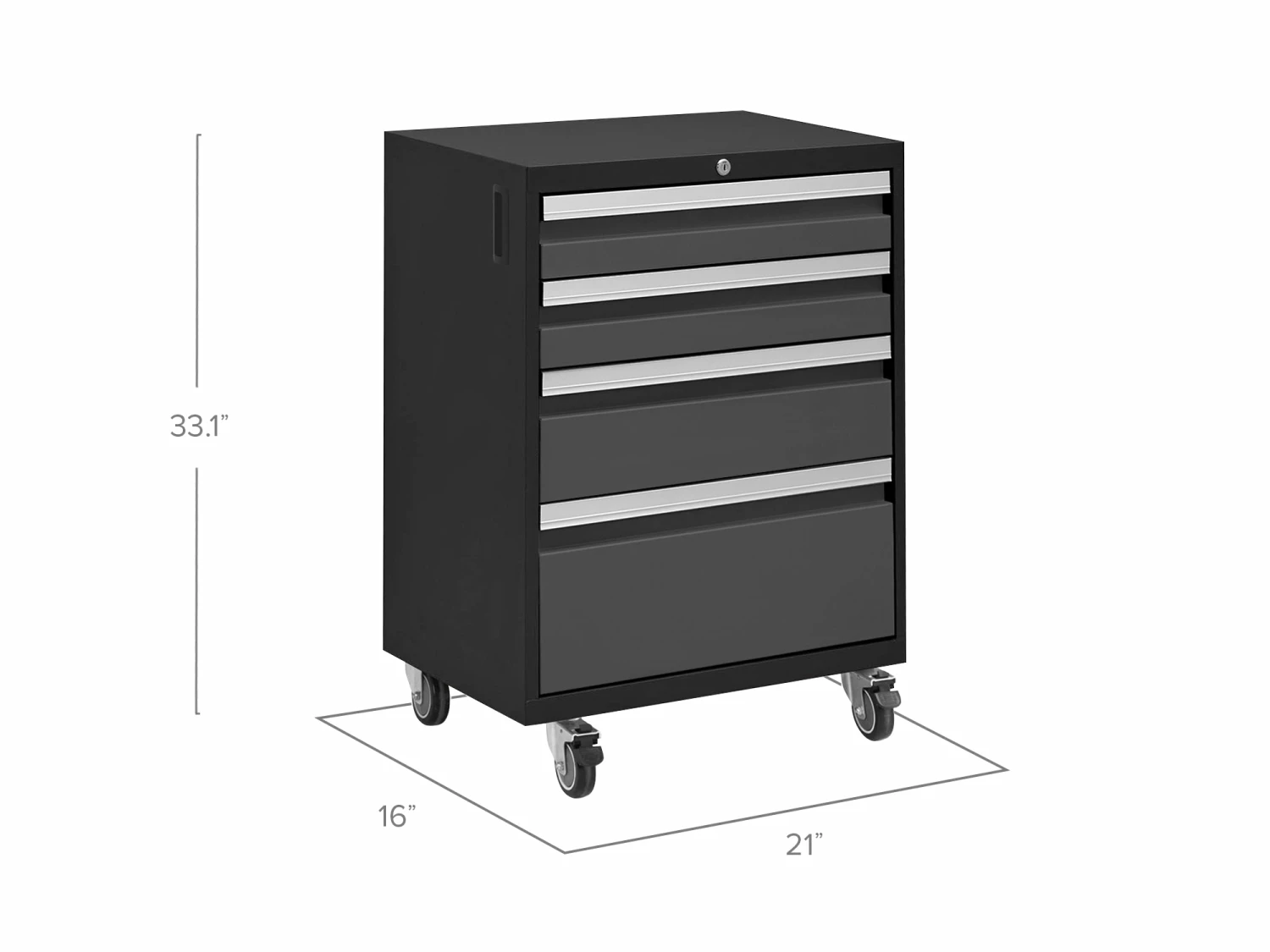Designed with a compact footprint for under-worktop storage, the Bold Series Rolling Tool Cabinet features 4 inch anti-tip casters, giving you a mobile storage solution for your garage. The 4 full-extension drawers on double ball bearing slides keep your tools separated and organized, with premium drawer liners to keep your gear in place. Inset handles on both cabinet sides allow you to easily maneuver your tool storage around your garage or shop, while the Sandtex powder-coat paint finish protects against scratches and scuffs. Lockable front casters keep your cabinet securely in place, while lockable drawers keep your tools protected and ready for your next project.