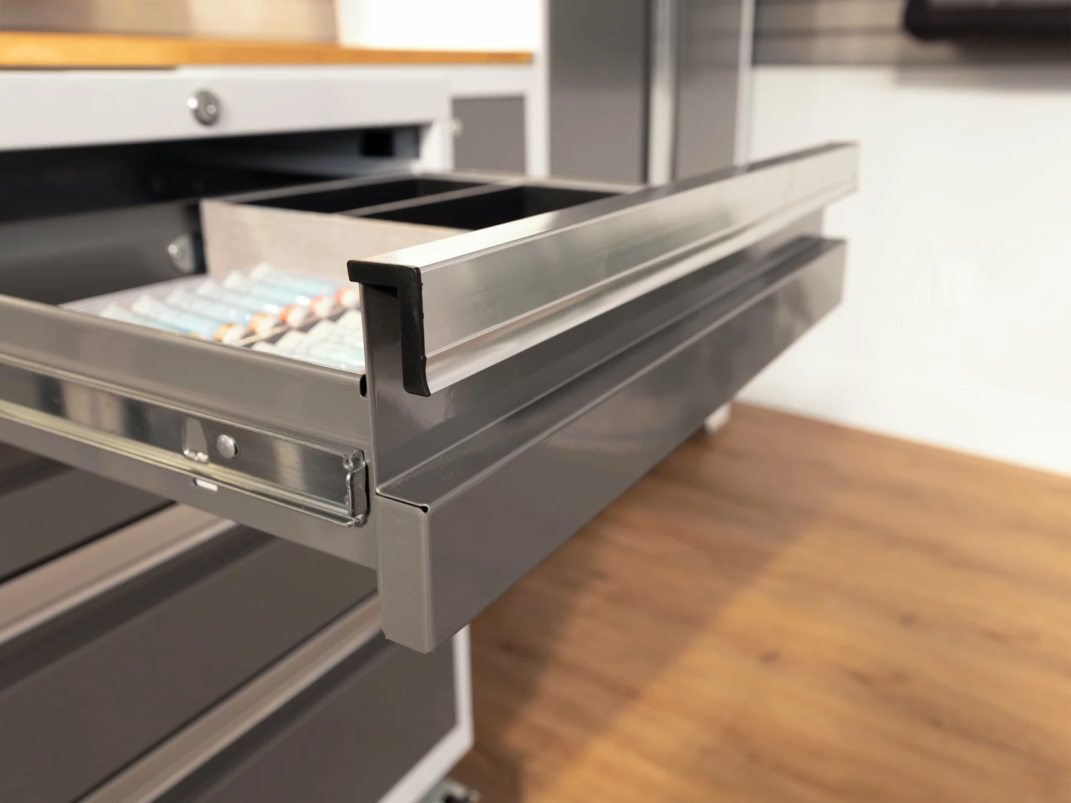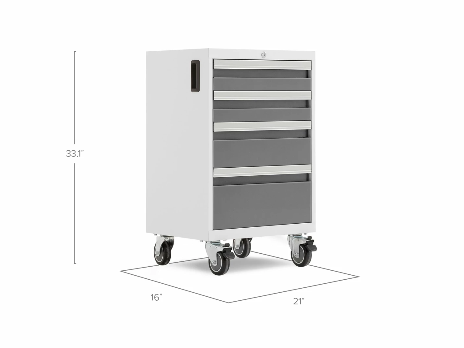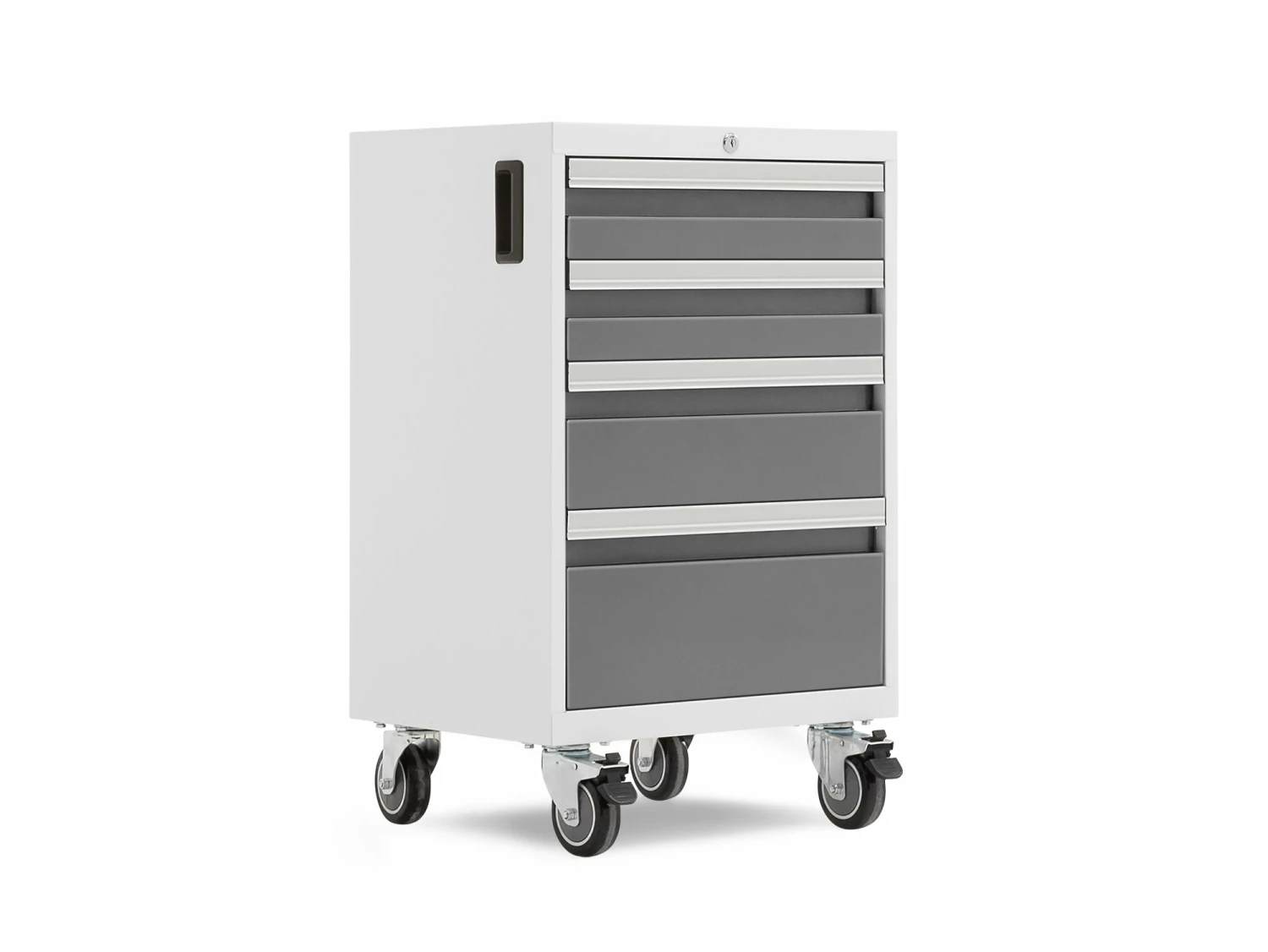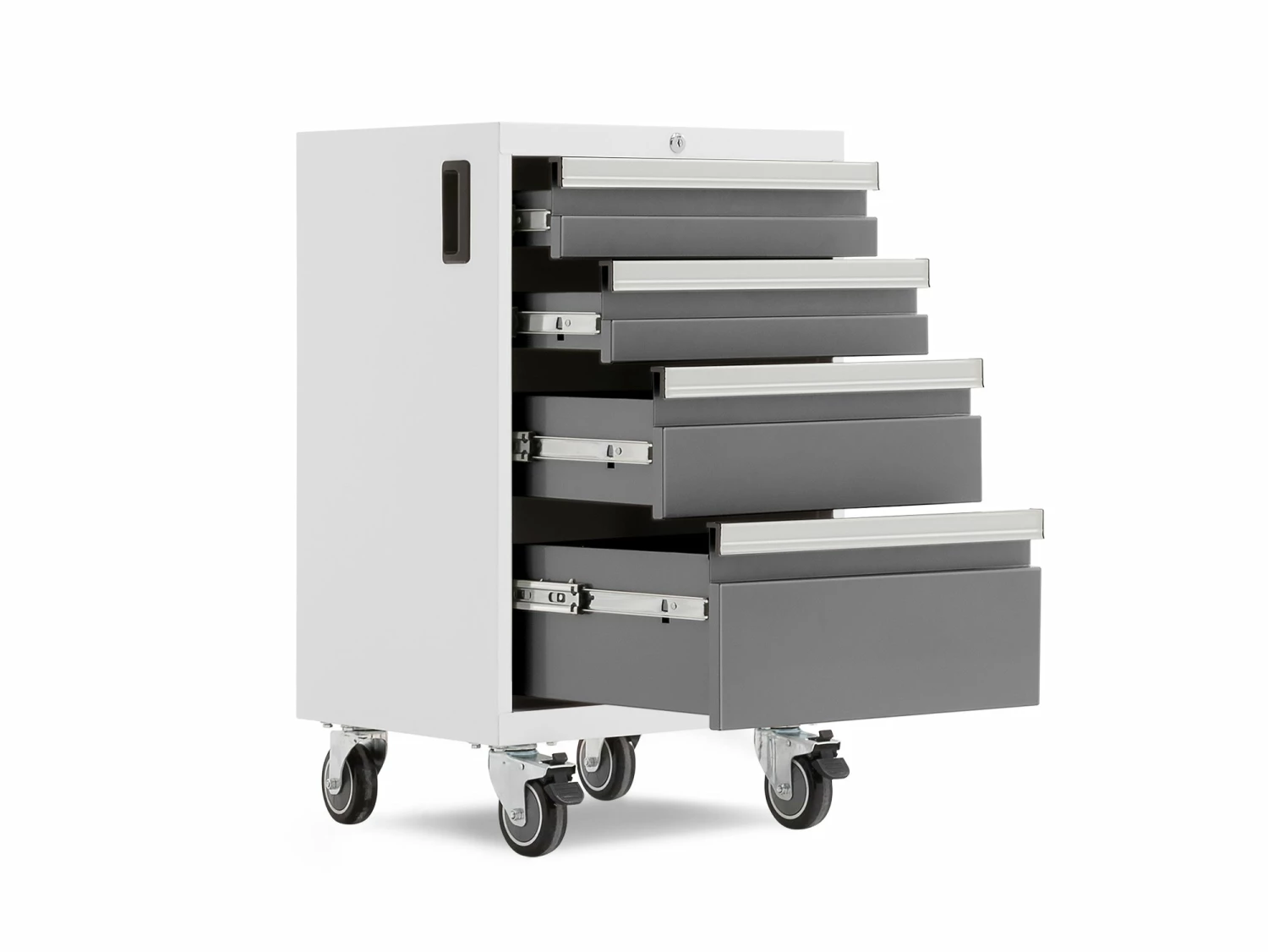 Designed with a compact footprint for under-worktop storage, the Bold Series Rolling Tool Cabinet features 4 inch anti-tip casters, giving you a mobile storage solution for your garage. The 4 full-extension drawers on double ball bearing slides keep your tools separated and organized, with premium drawer liners to keep your gear in place. Inset handles on both cabinet sides allow you to easily maneuver your tool storage around your garage or shop, while the Sandtex powder-coat paint finish protects against scratches and scuffs. Lockable front casters keep your cabinet securely in place, while lockable drawers keep your tools protected and ready for your next project.