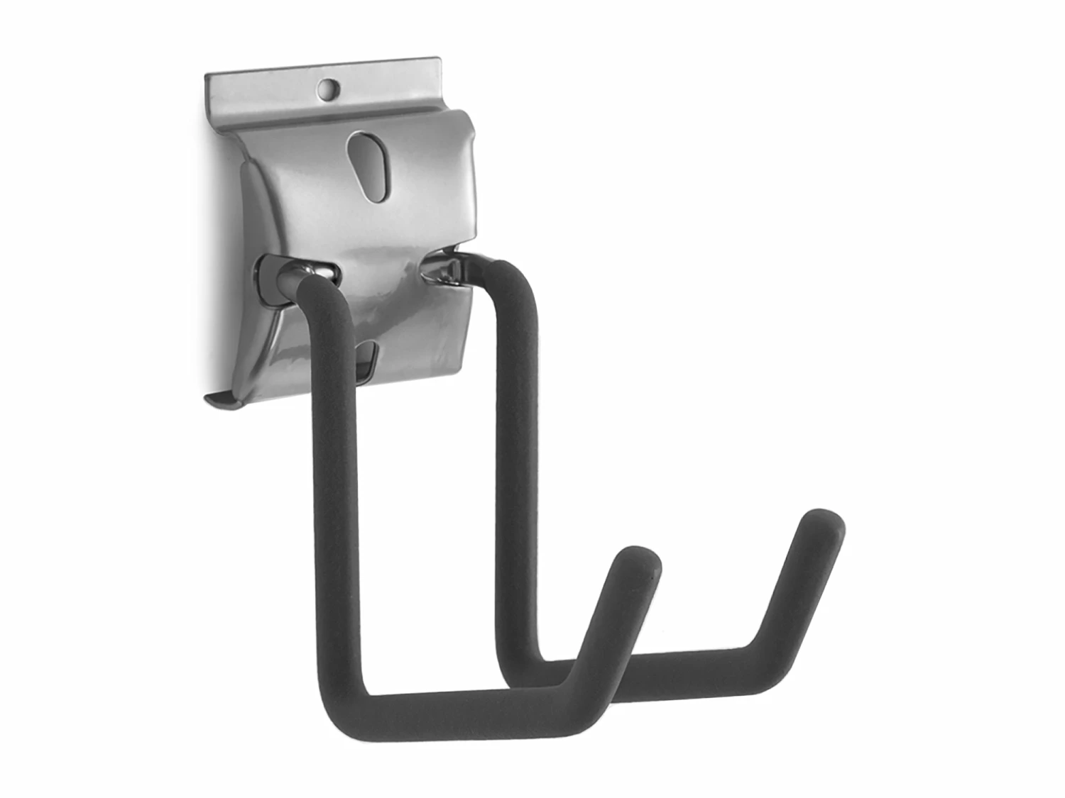 Maximize your slatwall system with NewAge Products Slatwall Accessories. Designed for use with NewAge Products Steel and PVC Slatwall systems, and compatible with most 3 in. on-center slatwall systems, our snap-in Slatwall Accessories are built with steel for extra strength. The powder-coat silver gloss finish looks great in any space and on both silver and black slatwall solutions. The J Hooks feature a protective rubber sleeve that helps prevent sliding and damage to chainsaws, leaf blowers, trimmers, and other large bulky items.