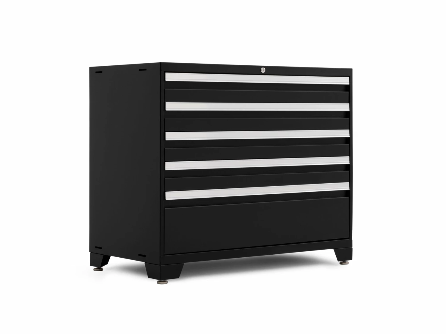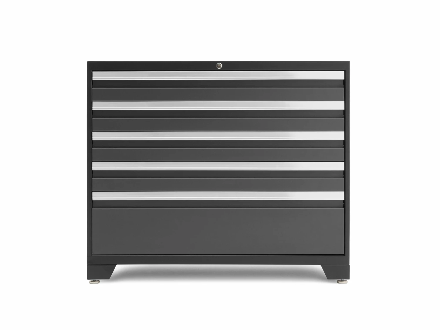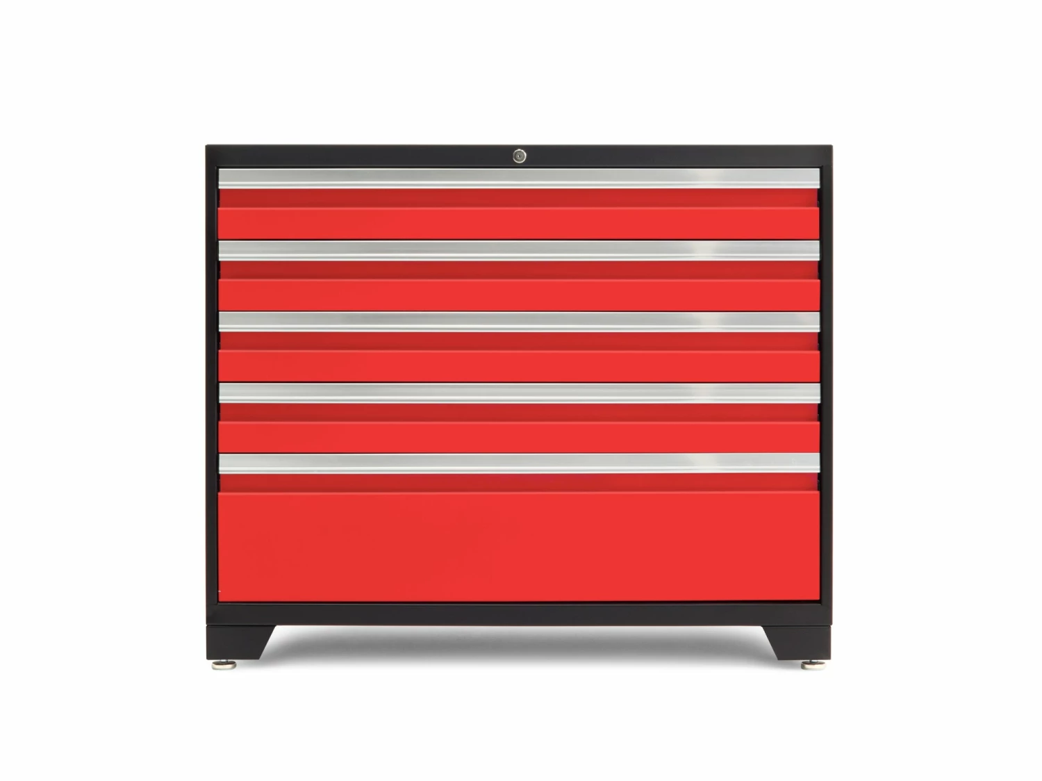 It’s time to ditch the rookie toolbox, and step up to the tool storage reserved for the Pros. The NewAge Products Pro Series 42 in. Tool Cabinet give you a massive amount of organized drawer space for storing power tools, plumbing supplies, electrical gear, painting and finishing equipment, and anything else you’ve got tucked away in every corner of your workspace. Built with heavy-gauge welded steel frames, and 5 huge full-extension drawers, this behemoth easily holds up to 1,000 lbs. of weight in a convenient storage solution that will keep you wondering how you ever lived without it. The premium soft-close drawer slides allow each drawer to glide smoothly open and closed, even under maximum weight, while the single locking mechanism allows you to quickly and easily secure your belongings. Included custom fit foam drawer liners protect your tools and prevent them from sliding around, while the slot-in steel drawer dividers give you more customization over how you separate your hardware and smaller items. The ultra-durable paint finish protects your Tool Drawer from scratches and dings from wayward hand tools, and keeps it looking like new. Installed on the floor, off the floor, on casters, or in a set, the Pro Series 42 in. Tool Drawer is the only tool storage that lets you work like a Pro.