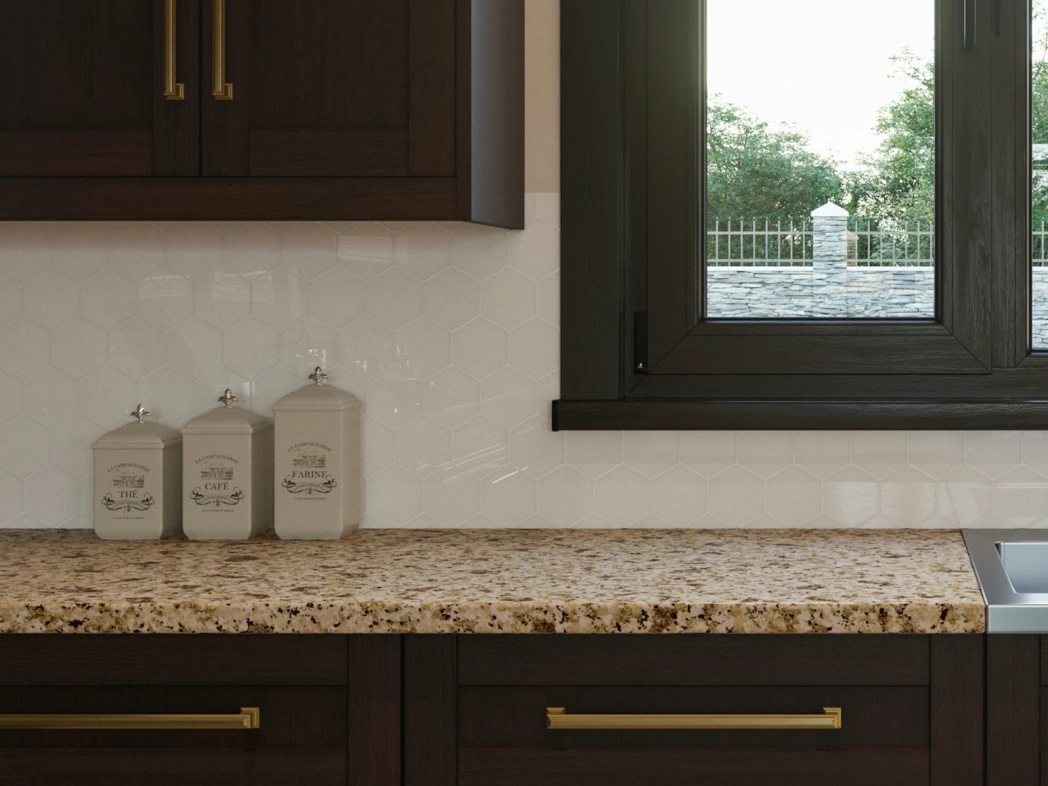 The Super White Glass Hexagon Tiles Backsplash will beautifully line the walls of your kitchen, decorating and protecting the area underneath and above your cabinets. Easy to install and clean, these are a fuss-free flourish, with the unique hexagon design gracing both contemporary and traditionally designed kitchens. Created using low temperatures to ensure the bright white back coating travels through the clear glass, these backsplash tiles will brighten the room, giving the illusion of more space in smaller kitchens. They can be used in kitchens, bathrooms or even around fireplaces, and they’re easy to install regardless of the size, shape and layout of the room.