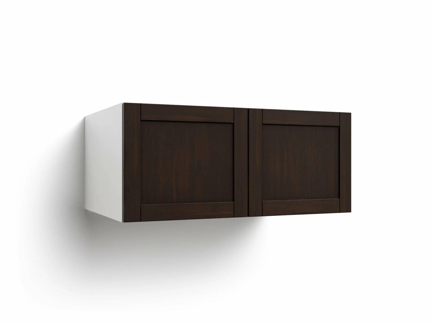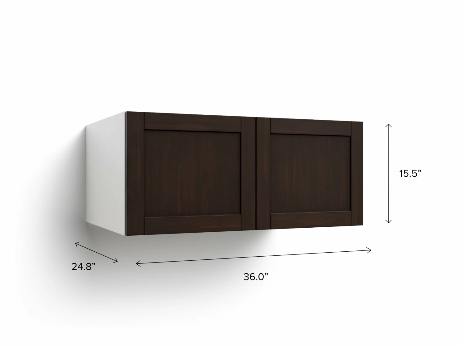 The area of wall above the fridge is often wasted, but our versatile and innovative Above Fridge Cabinet allows you to make the most of this empty wall space. At 36″ wide, this fits perfectly above most double door fridges. The range of additional custom options ensures you can make this cabinet your own. Complete with premium soft-closing hinges and two durable doors, this cabinet offers extra storage for a relaxing, clutter-free kitchen. It’s easy to install, and each fridge cabinet can be matched with the rest of your cabinetry. Choose from a range of paint colors on our 18.5mm Lacquer MDF door, or stains on our 19mm stained solid wood door.
