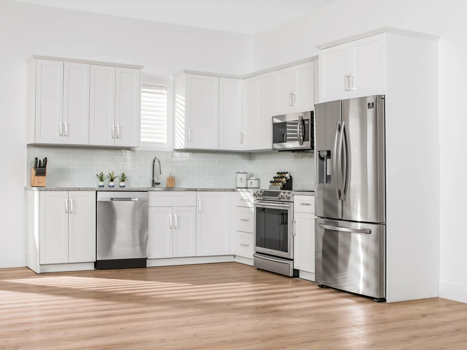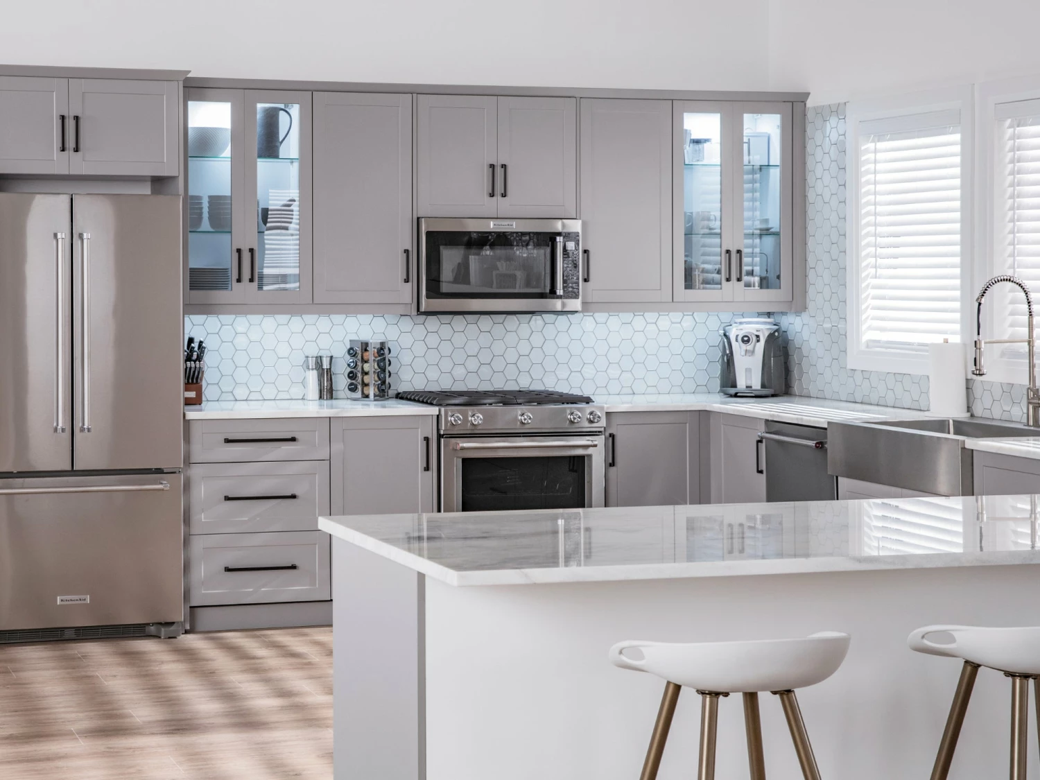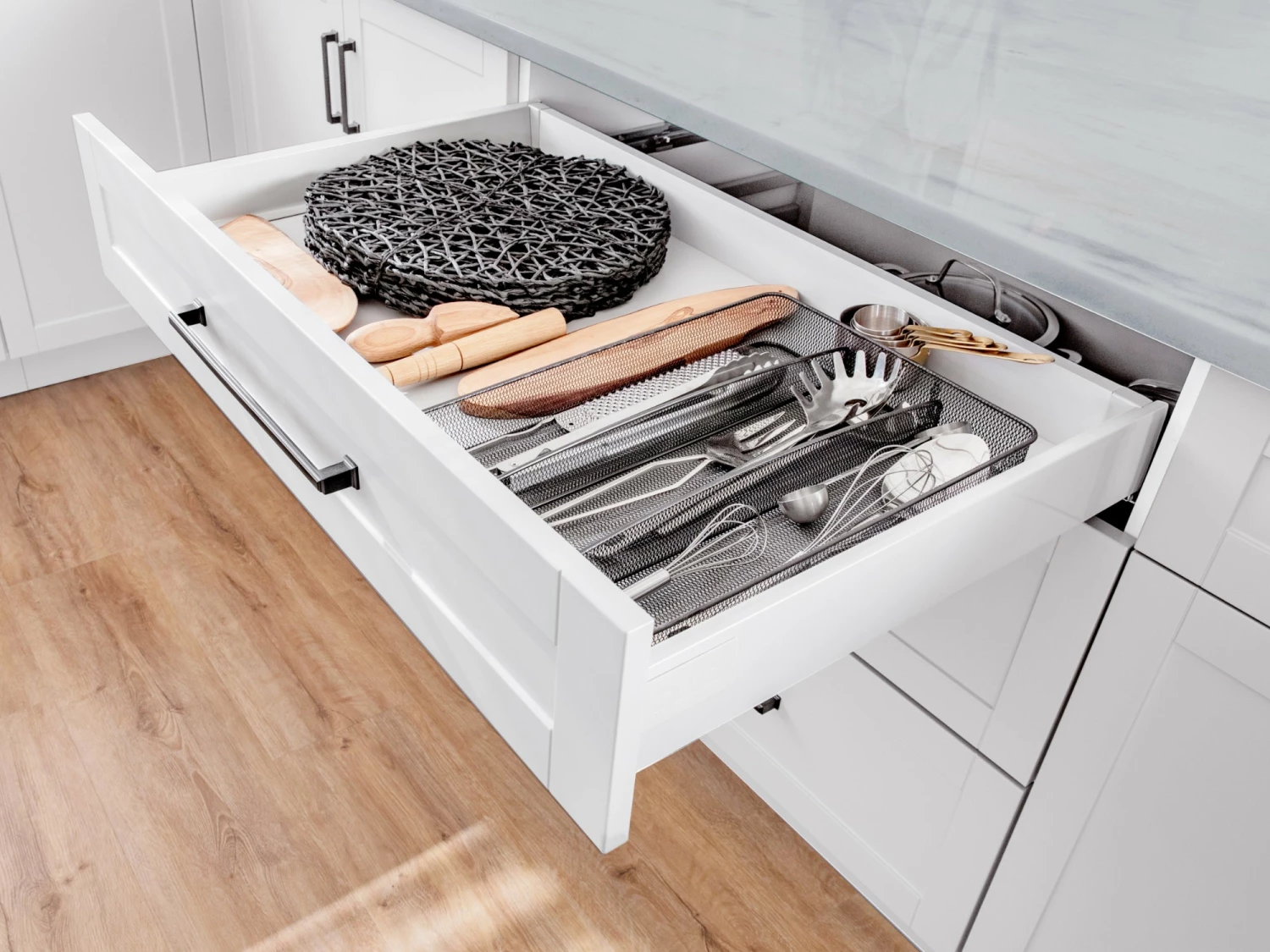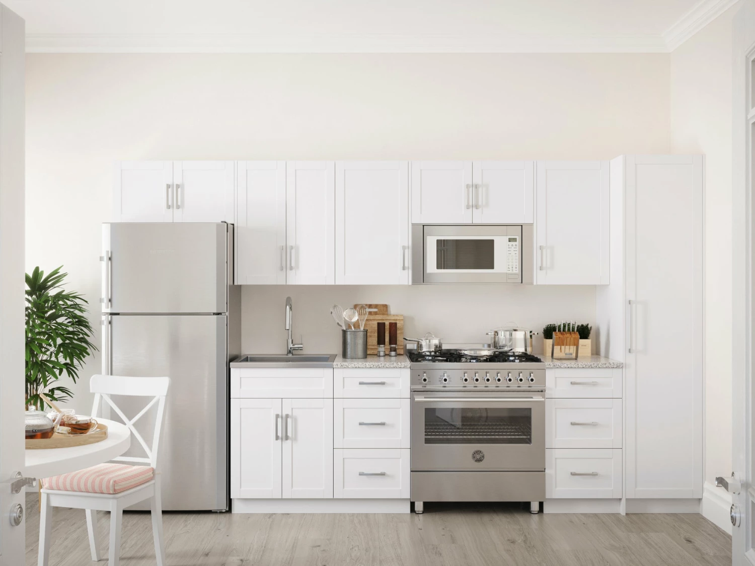 Expertly designed in every detail, our pre-configured Kitchen Sets arrive fully assembled, making them the time-saving, cost-saving way to get a brand new kitchen. Soft-close metal drawer slides and hinges add upscale functionality that’s perfectly complemented by a deep basin, premium stainless steel sink with contemporary pull-down faucet. Strong frames support your everyday items, and our thick 19mm doors are constructed with four layers of lacquer over an MDF core for a smooth, durable matte finish in your choice of classic Gray or vibrant White. The high-end 1-1/4”natural granite countertop completes the look with durable elegance. Your set also includes sleek, modern handles and all the premium millwork you’ll need for a perfectly-finished new kitchen. Cabinet organization accessories sold separately.