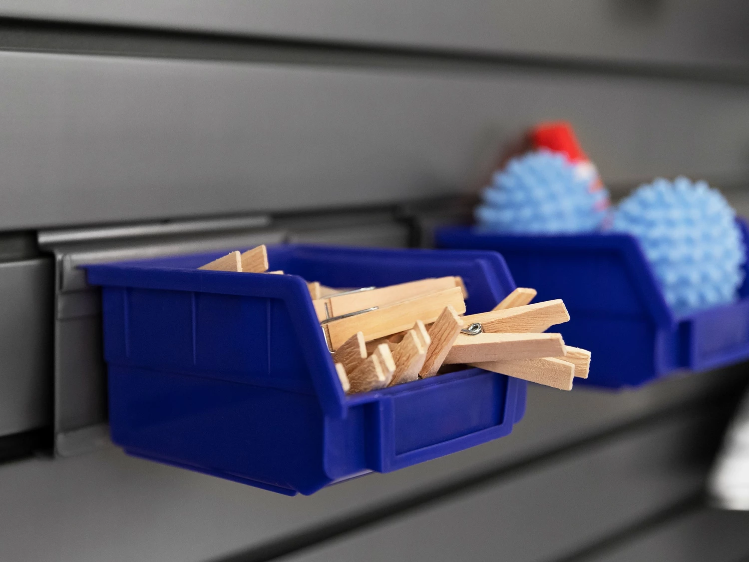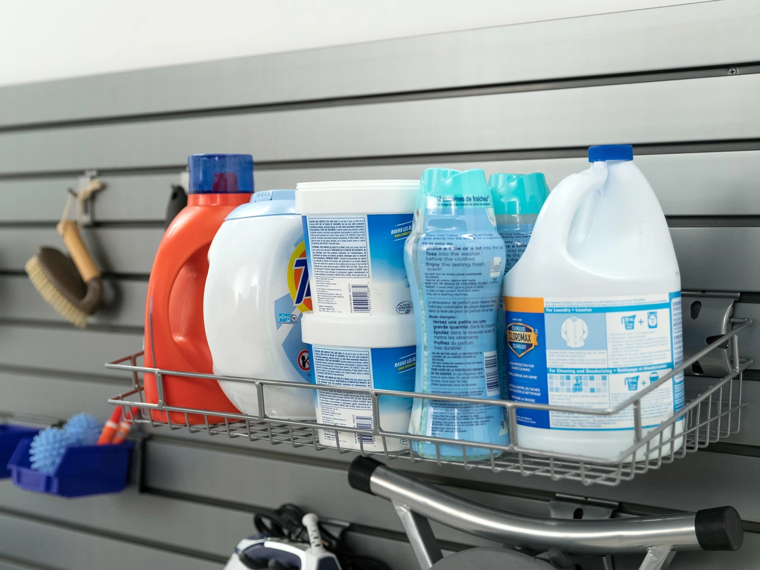 Organize all your household items on your slatwall solution with a variety of hooks, baskets, shelves, and other specialty accessories. Designed for use with the NewAge Products Steel Slatwall and PVC Slatwall options, and compatible with most 3 in. on-center slatwall systems, the NewAge Products Home and Laundry Slatwall Accessory Kit includes everything you need for storing cleaning supplies, detergent, ironing boards, and other household items. The extra strong steel hooks keep your smaller items like dust bins, and scissors efficiently organized, while the Double Hooks are perfect for getting mops, brooms, and ironing boards off the ground. With a lip to prevent your items from falling off, the Shallow Basket is ideal for storing cleaning supplies and laundry detergent. With a 30 lbs. weight capacity, the 2 ft. Wire Shelves provide storage for buckets, rags, and bins. The Blue Parts Bin are great for storing small quick grab items like clothes pins and sponges. Included in the kit are Parts Bins Support brackets for use on PVC Slatwall. The Paper Towel Holder lets you tear sheets one-handed for quick tidying. The Home and Laundry Slatwall Accessory Kit turns any slatwall system into the perfect storage hub for all your household supplies.