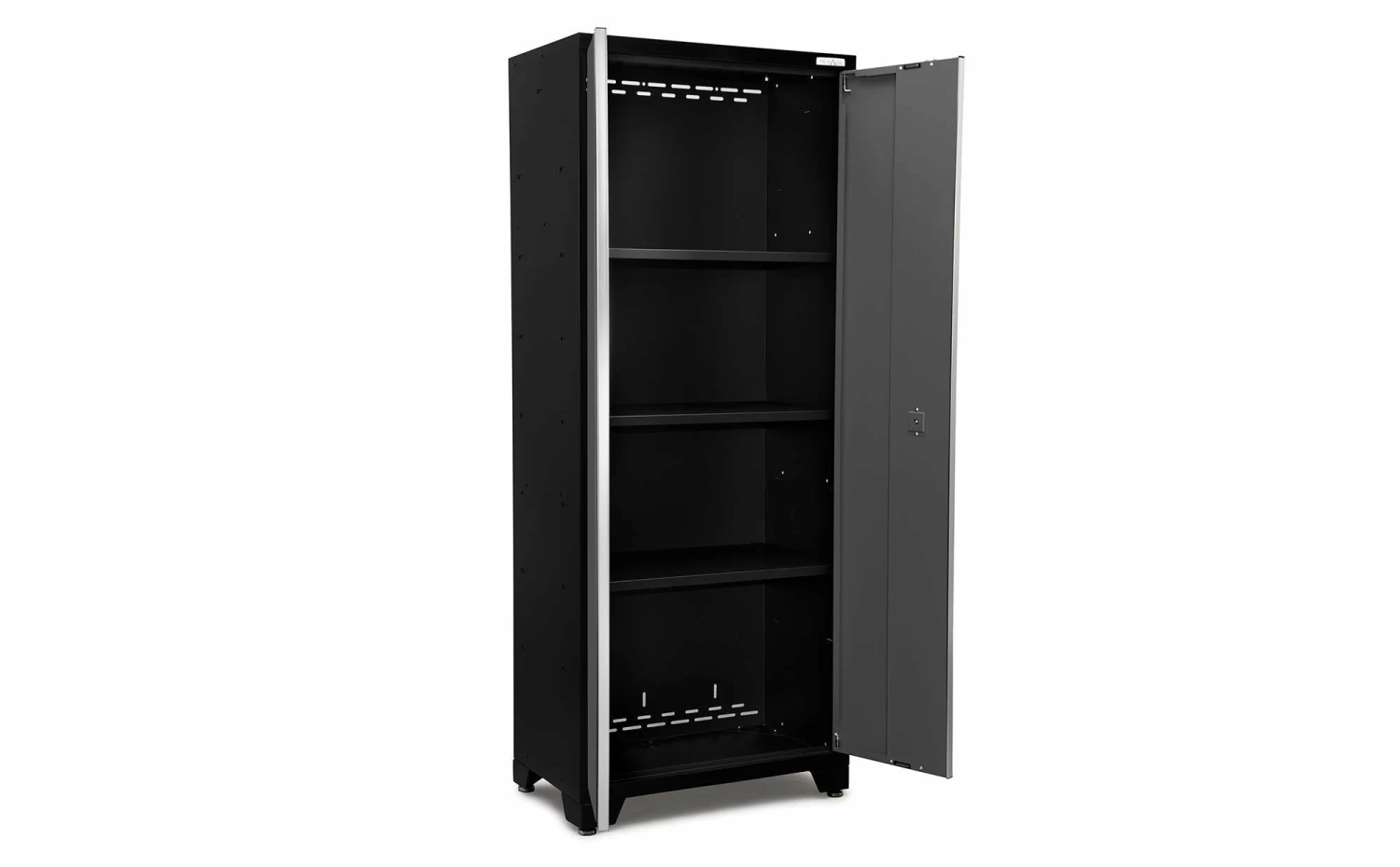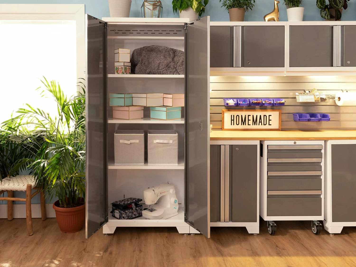 Designed to make a big statement in garages, workshops, mudrooms and other areas of your home, the Bold Series cabinet system instantly upgrades the look of your space, providing you with organized storage for all your belongings. Built with heavy-duty 24-gauge steel for added strength, these cabinets are ready to hold everything from sports equipment to gardening tools, and the scratch and stain resistant powder-coat paint finish protects the cabinets from everyday heavy use. Full-length integrated handles allow you to quickly and easily access your gear, and adjustable steel shelves give you the flexibility to store items of all sizes, while fully-lockable doors ensure that your tools stay safe. Get organized, and simplify your life, with Bold Series Garage Cabinets.