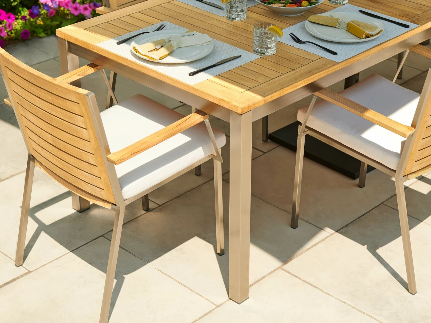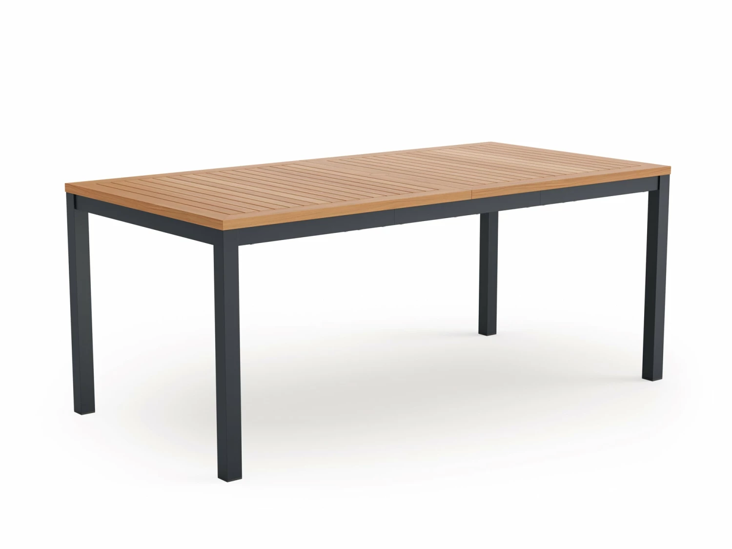 - Contemporary slatted tabletop crafted in premium natural teak
