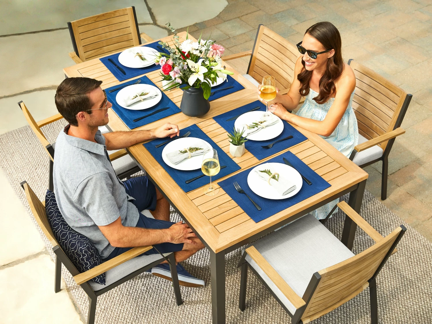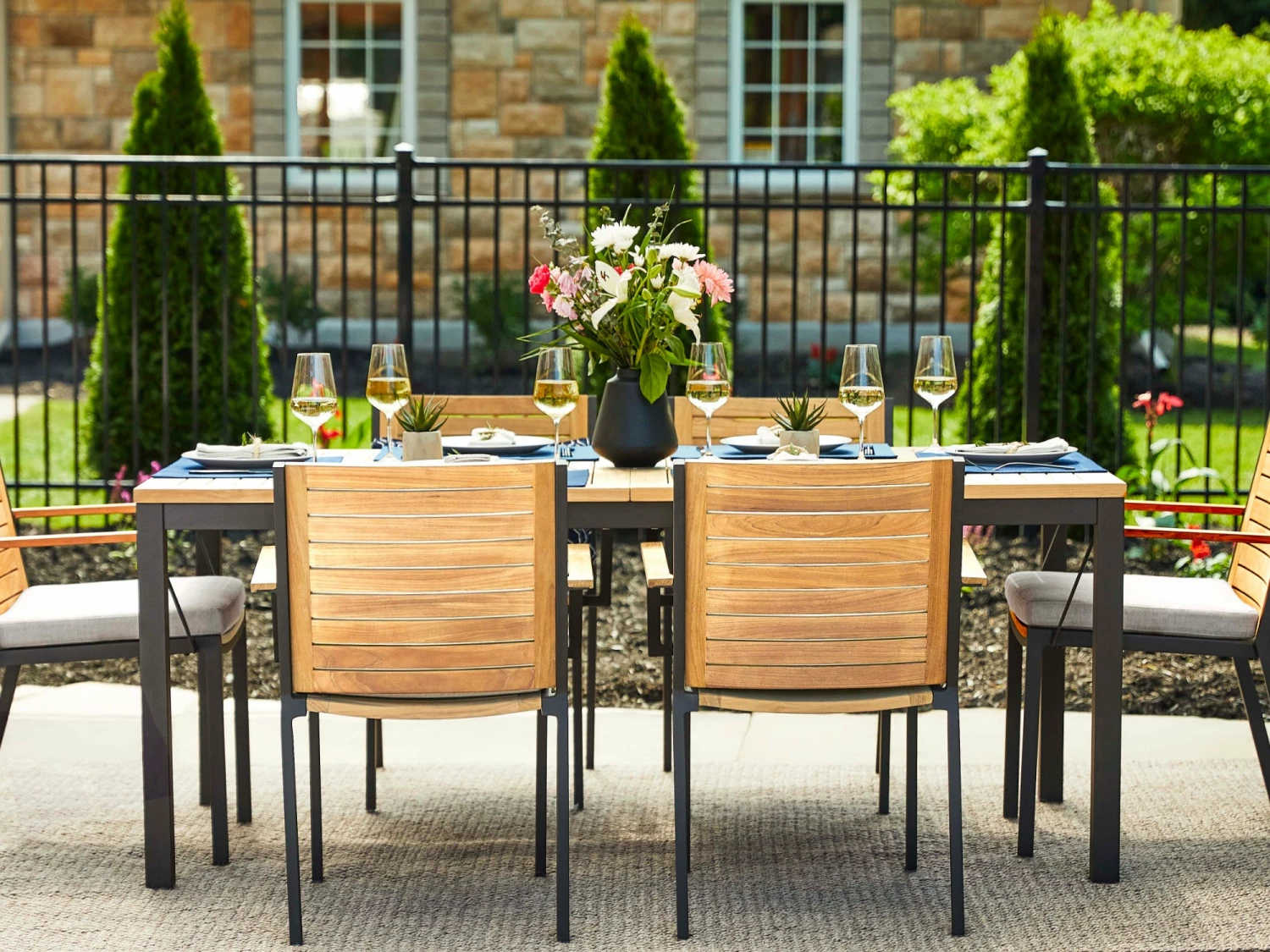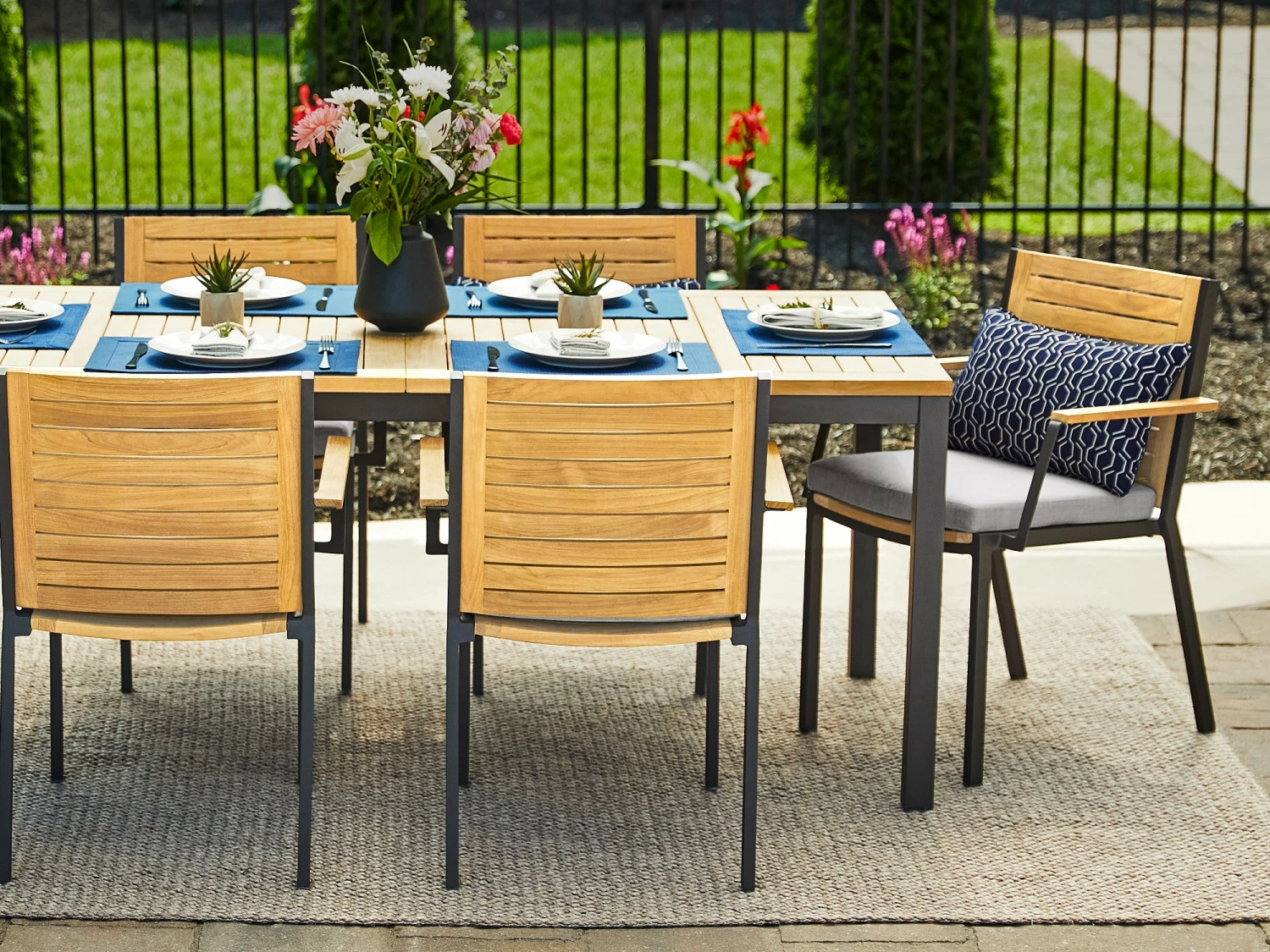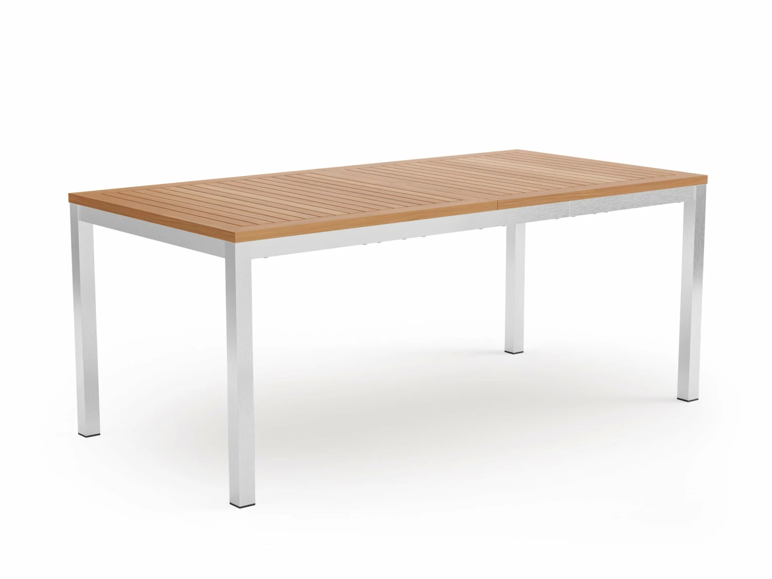 The NewAge Products teak Dining Table exudes a contemporary elegance and welcoming warmth, sure to be an entertaining centerpiece that family and friends will gravitate to. The spacious tabletop is constructed from premium natural teak with a modern, slatted design, creating a beautiful surface that complements our Monterey, Rhodes and Lakeside dining chairs while adding natural beauty and warmth to any backyard space. The elegant teak tabletop is supported by a sleek, yet robust frame and legs, meticulously crafted in your choice of bright stainless steel or the dusky contrast of powder coated aluminum. Available in 72” and 96” lengths, NewAge Outdoor Dining Tables’ 2-piece top assembly allows for a quick and simple set up, and the removable teak center plug provides easy placement of our premium patio umbrellas.
