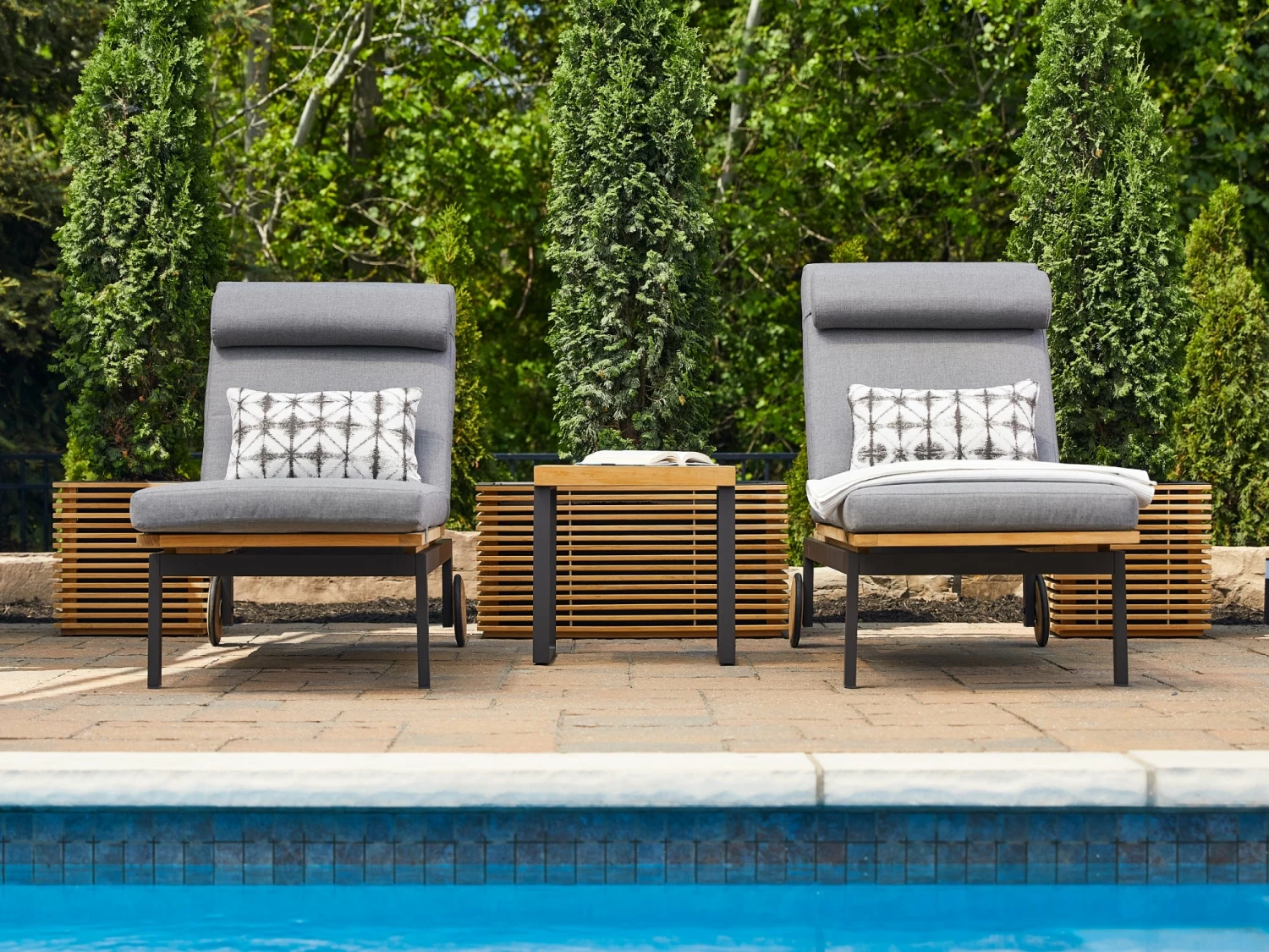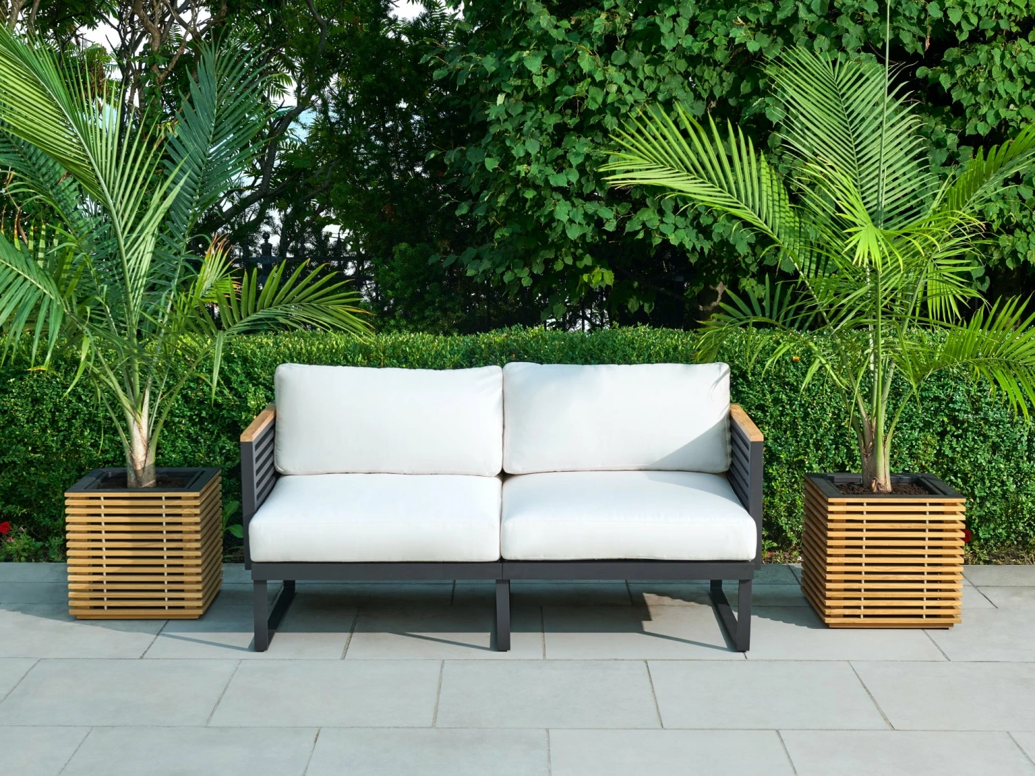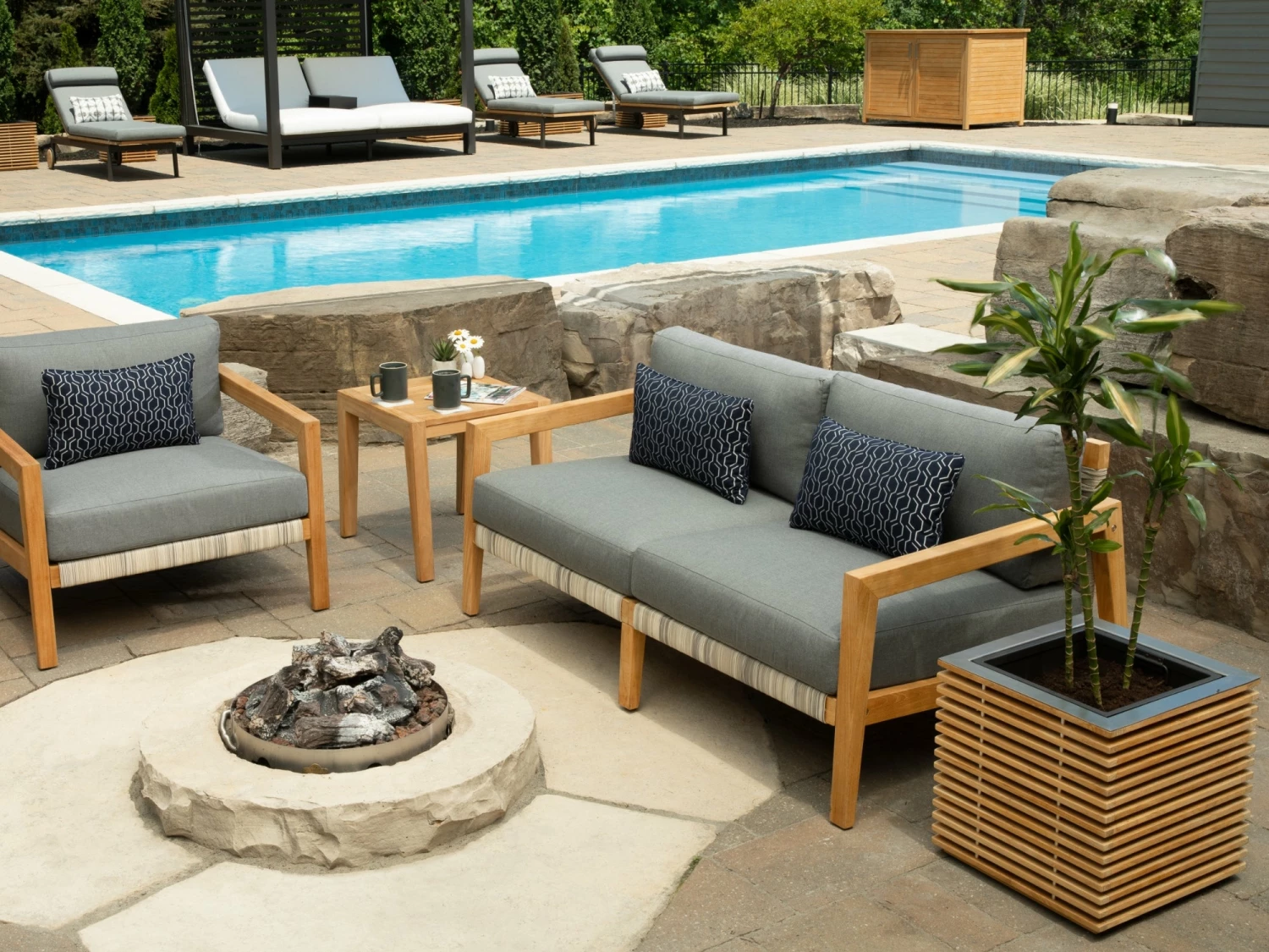 - Slatted teak exterior coordinates with other set pieces