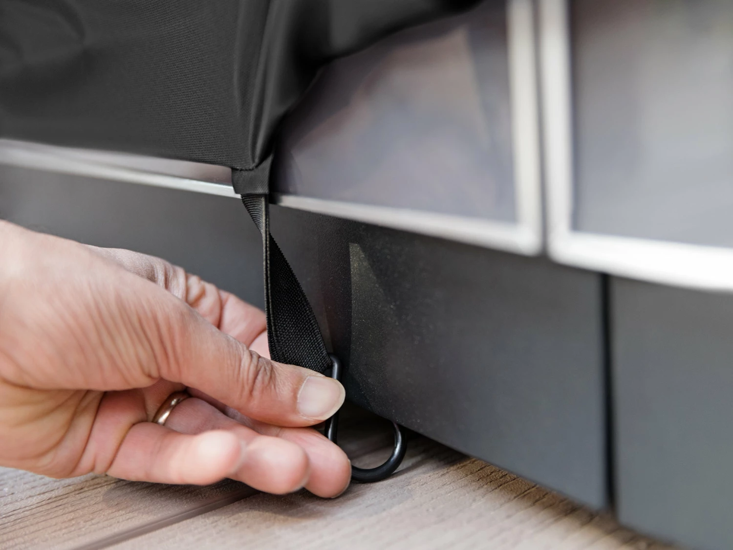 - Elastic, high-wind retention hooks safely secures covers to cabinets