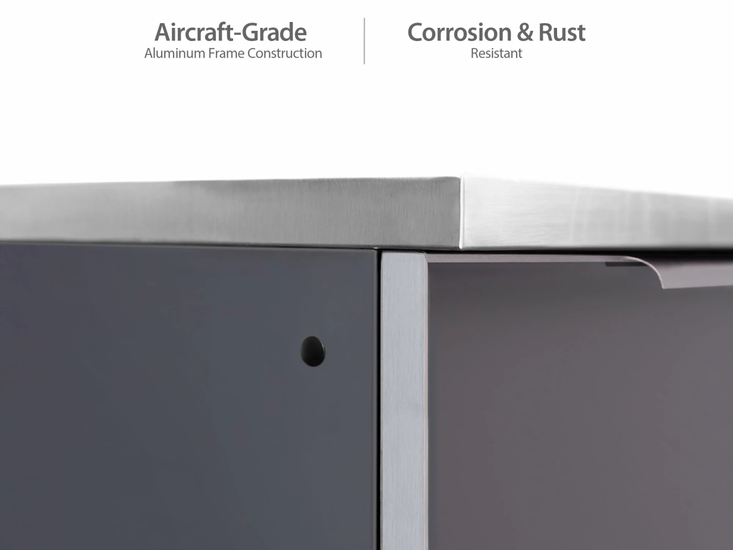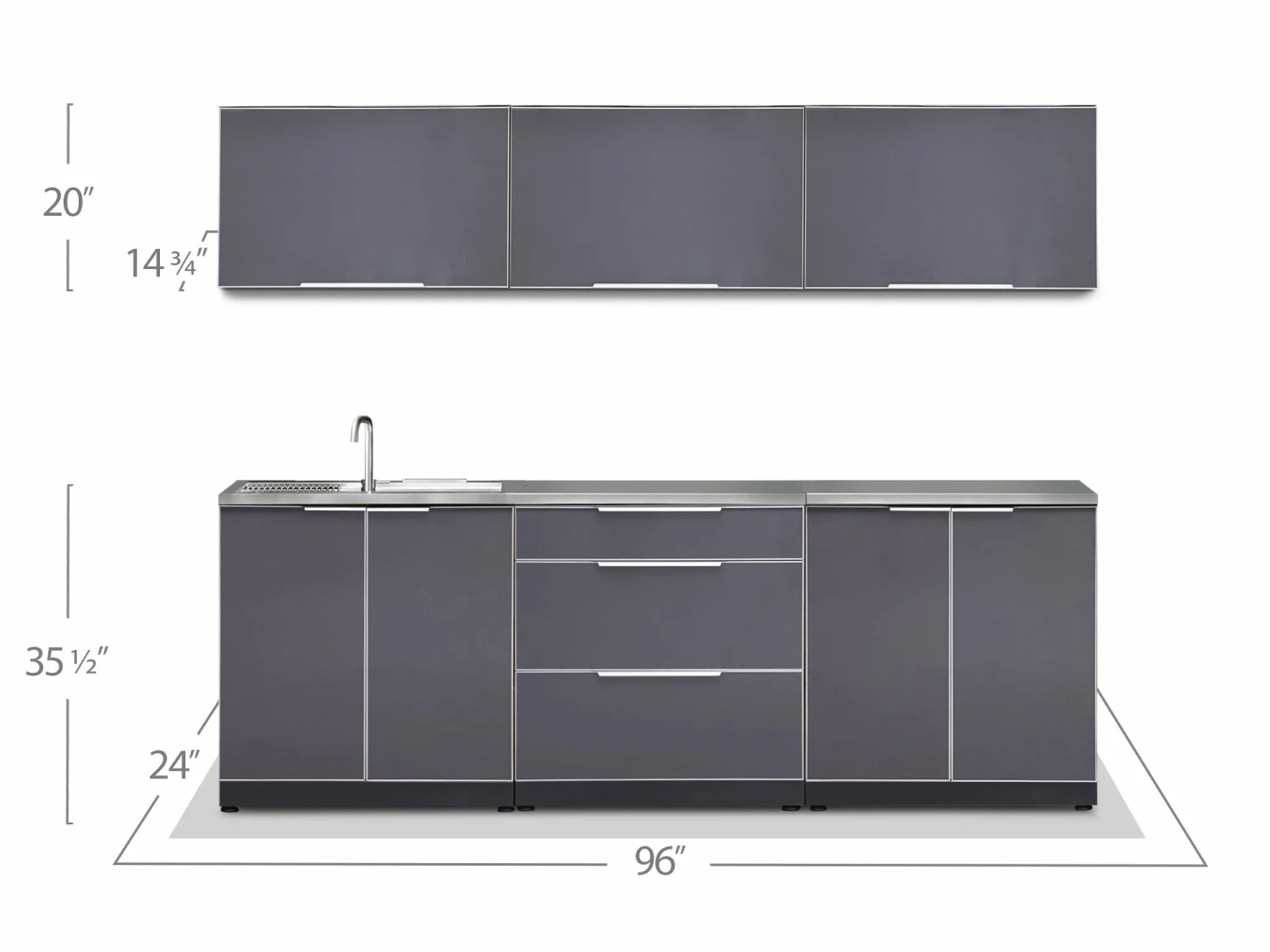 Add modern, functional storage to your exterior living space with Outdoor Kitchen cabinets in Slate Gray. Constructed from aircraft-grade aluminum, these strong and durable cabinets offer plenty of weather-resistant storage to help you get organized. Slate-gray tempered glass doors with integrated handles provide a modern, sleek style that compliments any home, and the height-adjustable levelers keep your cabinets level on uneven decks and patio stones. Adjustable shelves and extra deep drawers provide the versatile storage space for storing items of all sizes, and soft-close hardware provides doors and drawers with a gentle close. The Sink Cabinet provides a convenient clean-up station for muddy hands and dirty dishes, with a 7 in. deep stainless steel sink basin, allowing you to spend less time in the kitchen, and more time with your guests. Keep organized and upgrade your backyard living space, with NewAge Products Outdoor Kitchen cabinets in Slate Gray. The pre-installed NewAge Outdoor Kitchen Sink (P/N H00112A-01) is certified to be used with the pre-installed NewAge Outdoor Kitchen Faucet (P/N H00097A-01) only. No faucet except for H00097A-01 should be installed onto this sink.