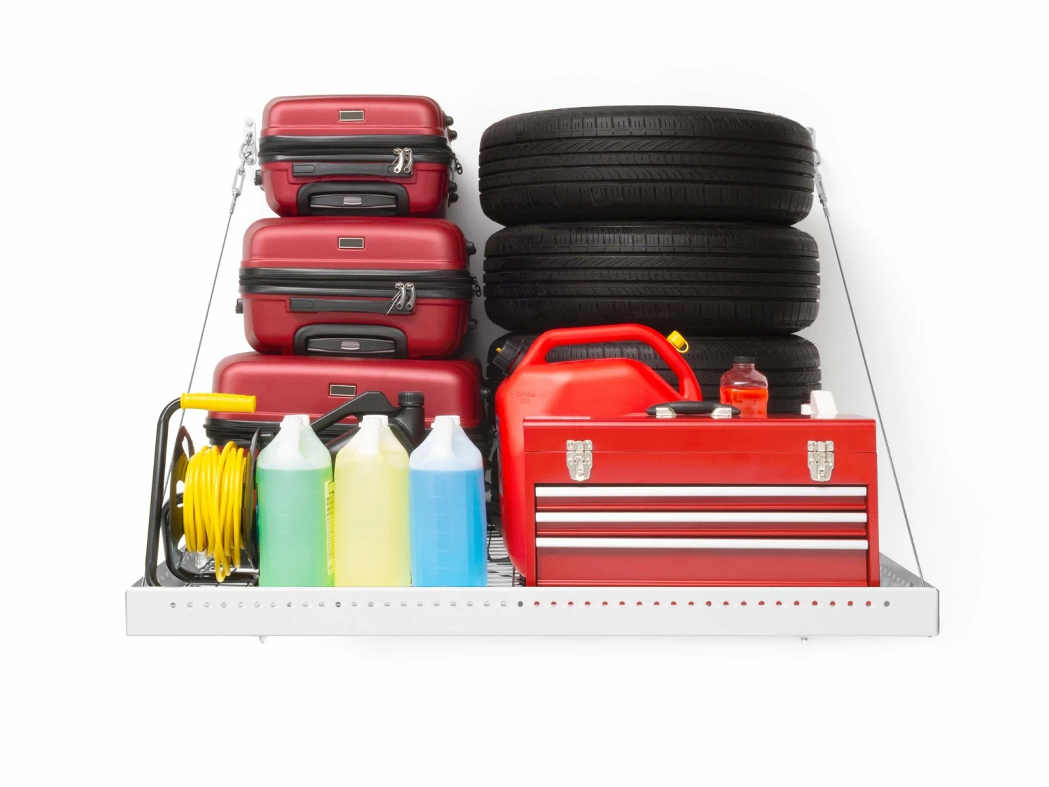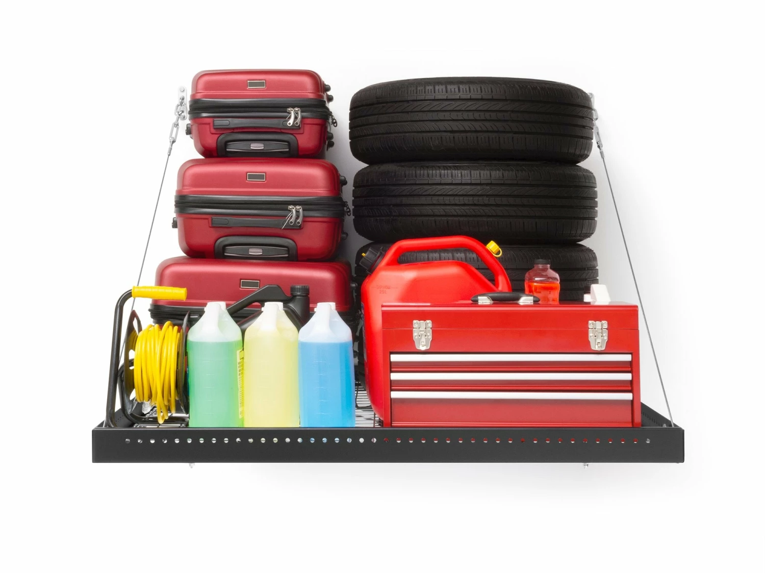 Keep organized, and maximize overhead storage space in your garage with the NewAge Products Pro Series Wall Mounted Steel Shelves. Our 4 ft. x 4 ft. Pro Series Shelf gives you the extra deep storage space to keep outdoor gear, tires, and large bins tucked away and organized. Perfect for corner spaces in your garage, this shelf can be stacked or combined with additional 4 foot deep shelves to create a massive storage platform. Aircraft-Grade steel support cables are tested to 3,000 lbs. for a safe solution that’s adjustable to your stud spacing. The strong frame is constructed from heavy gauge steel and a C-Shaped front perimeter beam, for a shelf that easily supports loads up to 600 lbs. The steel wire decks drop securely into the cross beam supports for even weight distribution, and a 1.25 inch perimeter safety lip prevents items from sliding off the edge. Overhead shelf storage done right; with Newage Products Pro Series Wall Mounted Steel Shelves.
