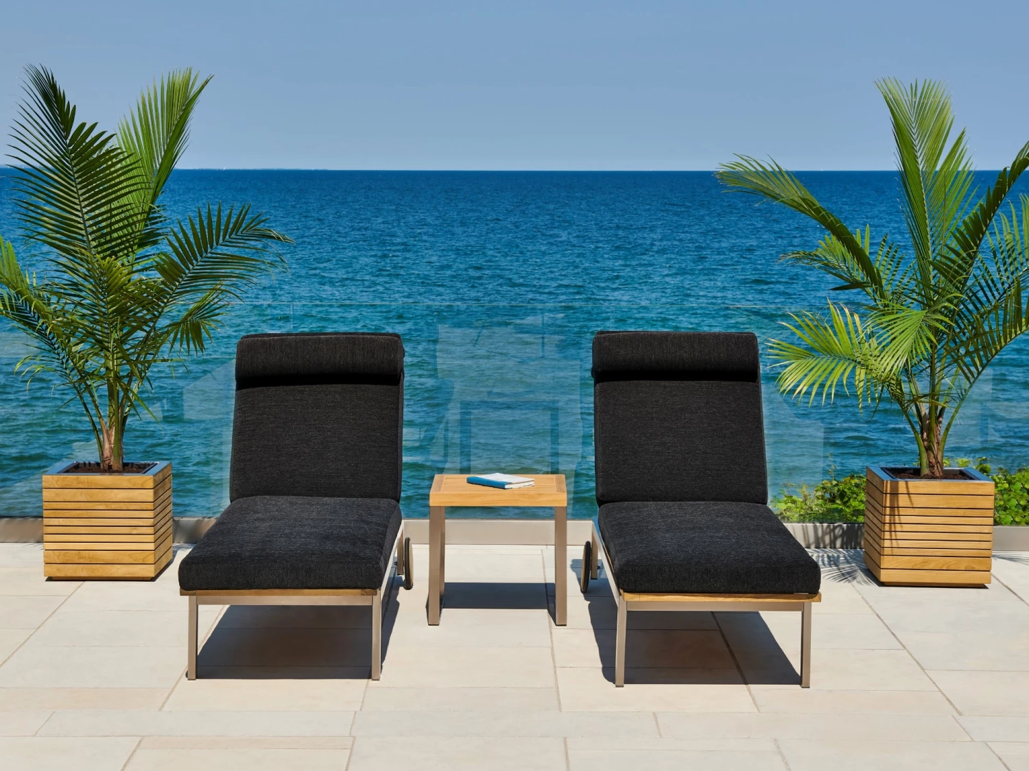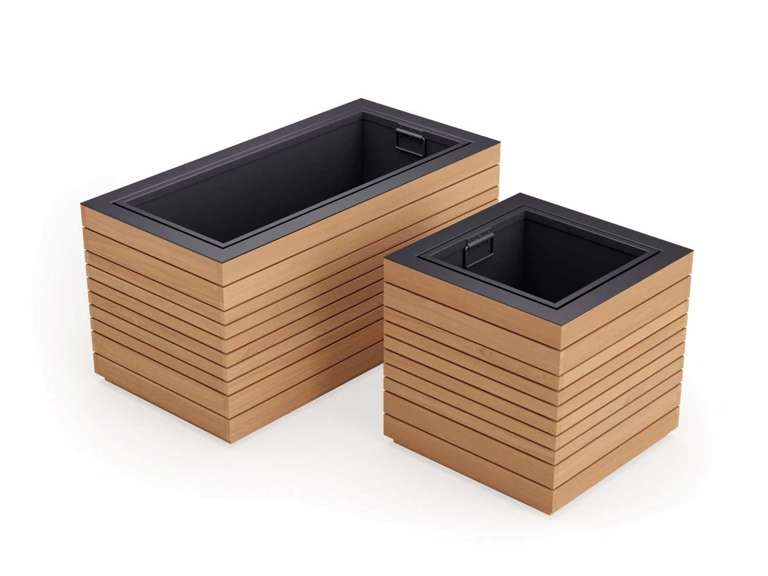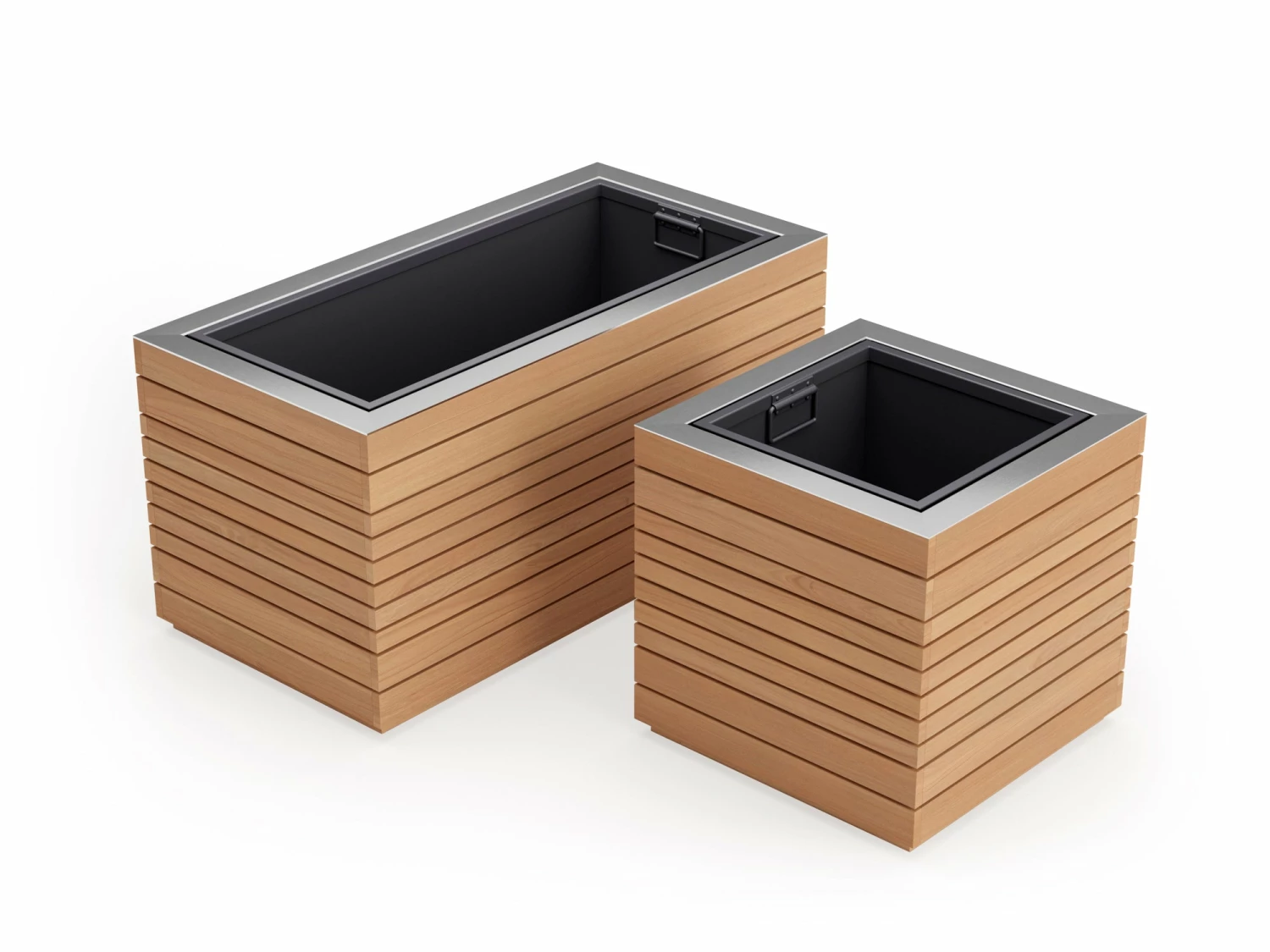 Dress up your backyard space with some natural greenery in eye-catching Rhodes Collection planters. Available in square or rectangular designs, the distinctive slatted design complements other collection pieces with an exterior case structure that’s crafted of premium natural teak for years of weather-resistant beauty. Top accent pieces in bright stainless steel or dusky powder coated aluminum add a further touch of contemporary style. The aluminum bin is both lightweight and corrosion resistant, ideal for wet outdoor conditions and easy to keep clean. Integrated hidden handles let you easily transport the interior bucket for planting or relocating. Decorative and versatile, our planters quickly convert to fashionable ice buckets. Simply line the insert bin with plastic, fill with ice and let the festivities begin.