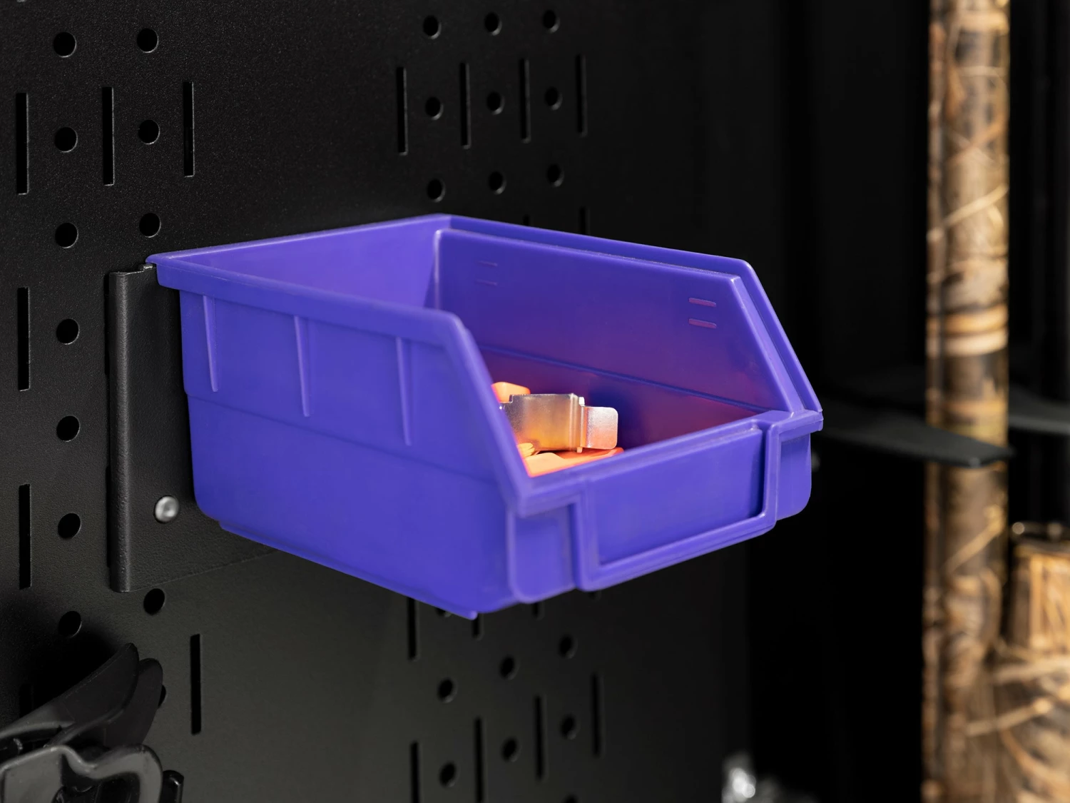 The NewAge Products Pegboard Parts Bins and Support Brackets are the perfect accessory for your Secure Gun Cabinet, as well as most pegboard storage solutions. The mounting plate is constructed from heavy-duty steel, and features a durable powder-coat paint finish. The plastic parts bins can hold up to 10 lbs. and is the perfect storage solution for small items. Easily install the mounting bracket to pegboard using the included self tapping screws.