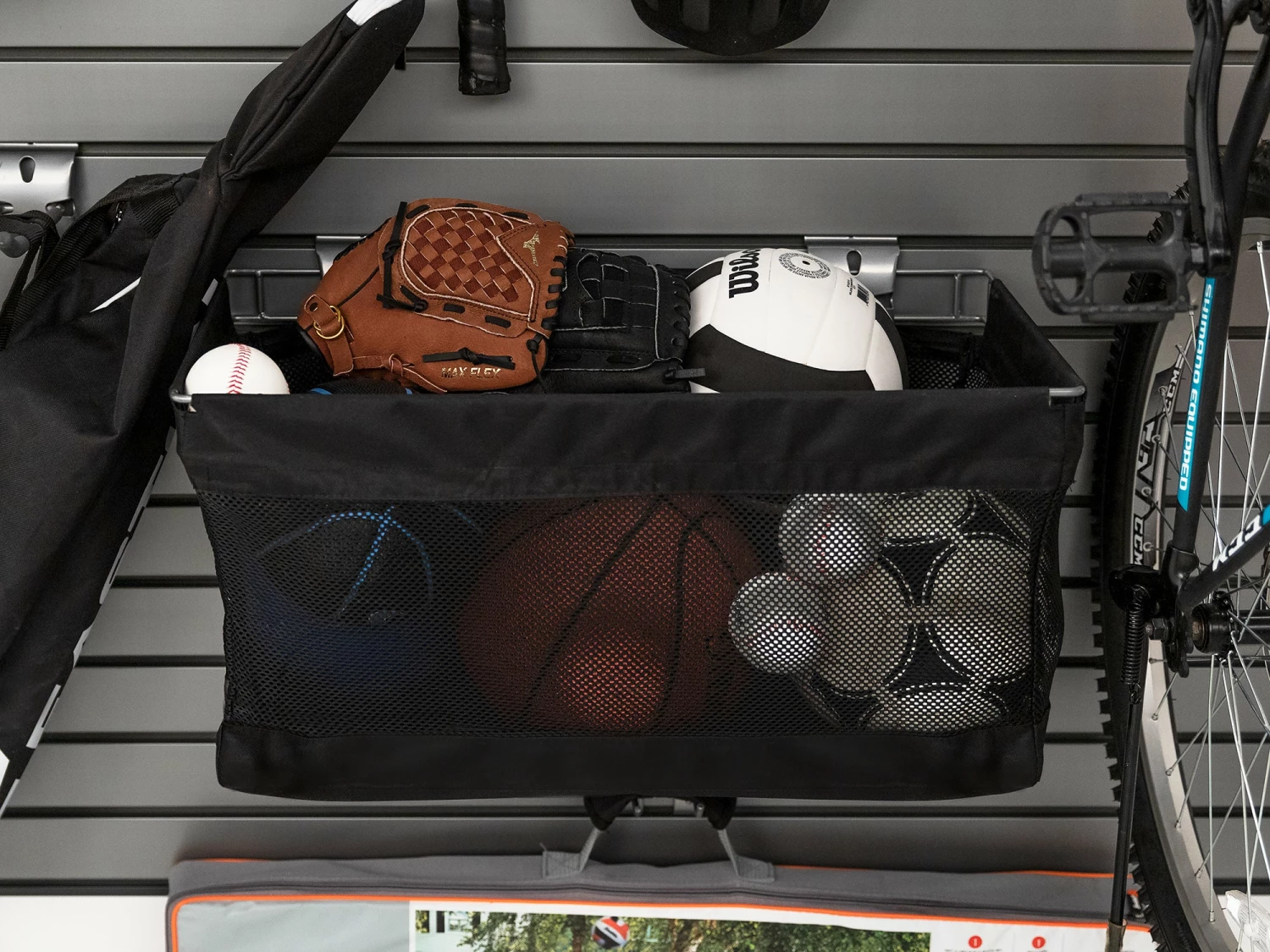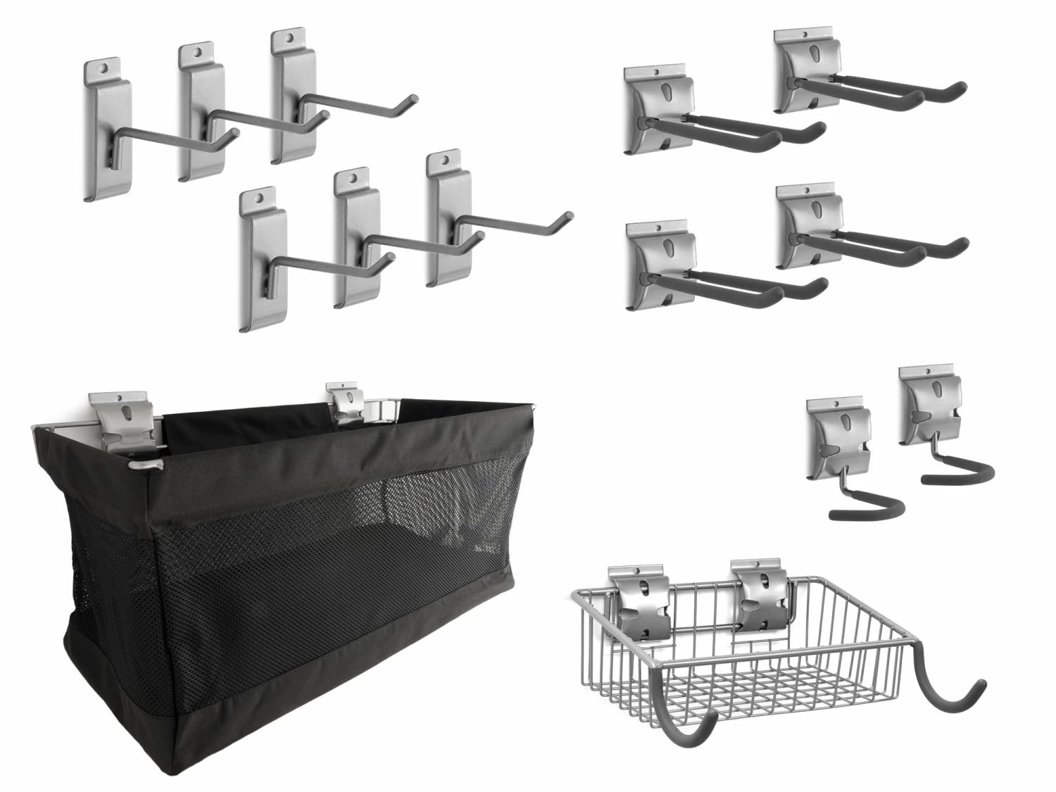 Get all your sports gear and equipment off the ground and onto your walls with the NewAge Products Sports Slatwall Accessory Kit. Designed for use with the NewAge Products Steel Slatwall and PVC Slatwall options, and compatible with most 3 in. on-center slatwall systems, the NewAge Products Sports Slatwall Accessory Kit includes everything you need for organizing all your sports gear. The extra strong steel hooks are great for hanging bags, bike helmets, and tennis racquets. The Double Hooks are perfect for storing baseball bats, bike pumps, and oars, while the Mesh Basket keeps balls and other sports equipment tidy. The Vertical Bike Hooks make it easy to wall hang your bicycles, for a cleared floor space. The Golf Hook and Shelf provides hanging storage for 2 golf bags, and a shelf to store other gear like golf balls and small coolers. Built with steel for extra strength, and a powder-coat silver gloss finish that looks great in any space, the Sports Slatwall Accessory Kit helps all your sports equipment organized.