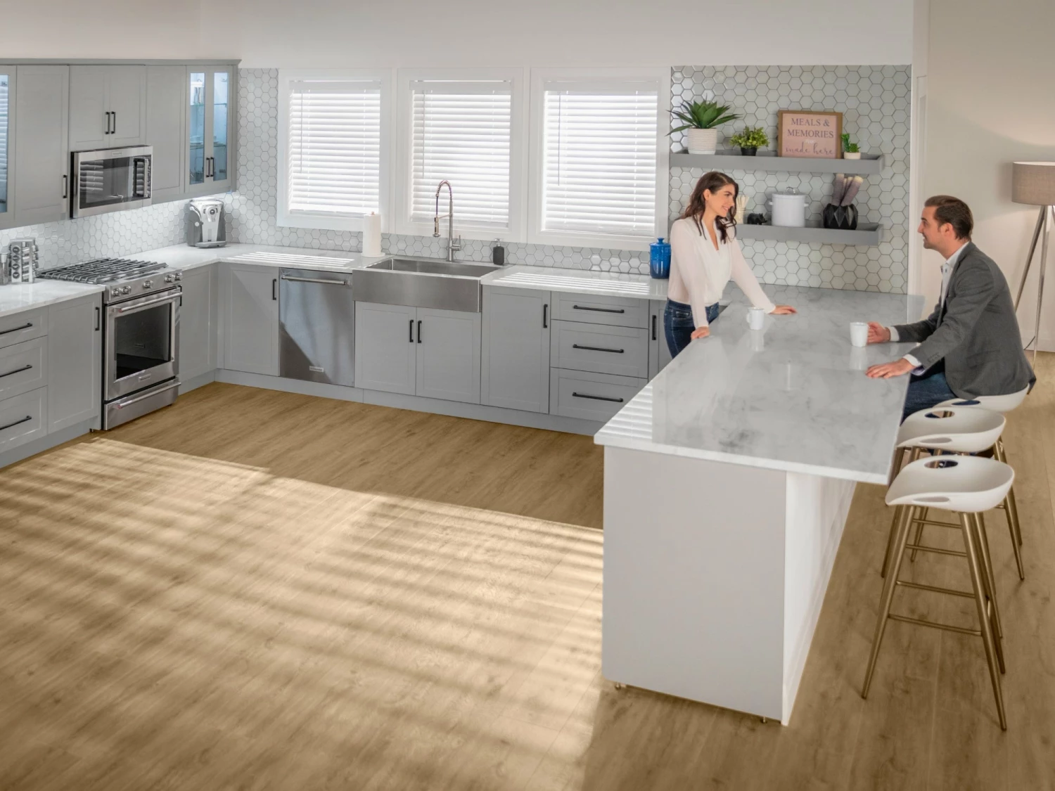 NewAge Stone Composite Luxury Vinyl Plank Flooring is the next evolution of resilient floors, with a commercial-grade 0.5mm wear layer and stone composite core that is waterproof when correctly installed. Built for durability and beauty, our floor planks meet the needs of the modern home, with the color and style options to improve the look of every space. Each engineered layer has been carefully selected for optimal material thickness and quality, based on rigorous testing, for the most durable, lowest maintenance flooring solution that improves your day-to-day living. A built-in UV resistant layer prevents fading and keeps your floors looking pristine, while providing added durability. The anti-mold IXPE foam backing not only eliminates the need for a flooring underlay, but also provides a softer feel underfoot with anti-fatigue and acoustic dampening features. Using high-resolution scans of real oak wood, our Plank style flooring features a natural oak wood grain layer offered in timeless color options. Embossed-In-Register (EIR) textures provide a realistic surface that looks and feels like authentic wood to the touch, without the maintenance needs of real wood. Our thick 5 mm flooring provides a stronger click-lock system, for an easy installation with reduced waste from damaged planks, and accessories such as stair noses, finishing strips, and wood grain color-matched transition pieces let you to build your perfect floor package. NewAge flooring is Floor Score Certified, meeting the strictest criteria for indoor air quality emissions and material safety standards. Ideal for your next room reno, NewAge Stone Composite Luxury Vinyl Plank flooring is the perfect flooring solution to build your home around. The 800 sq. ft. LVP Flooring Bundle offering makes your buying more worthwhile. Location lighting and device calibrations affect the appearance of finish and colors. We recommend ordering a material sample to ensure your choice suits your requirements before purchasing.