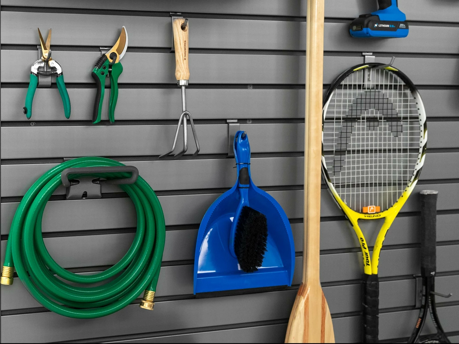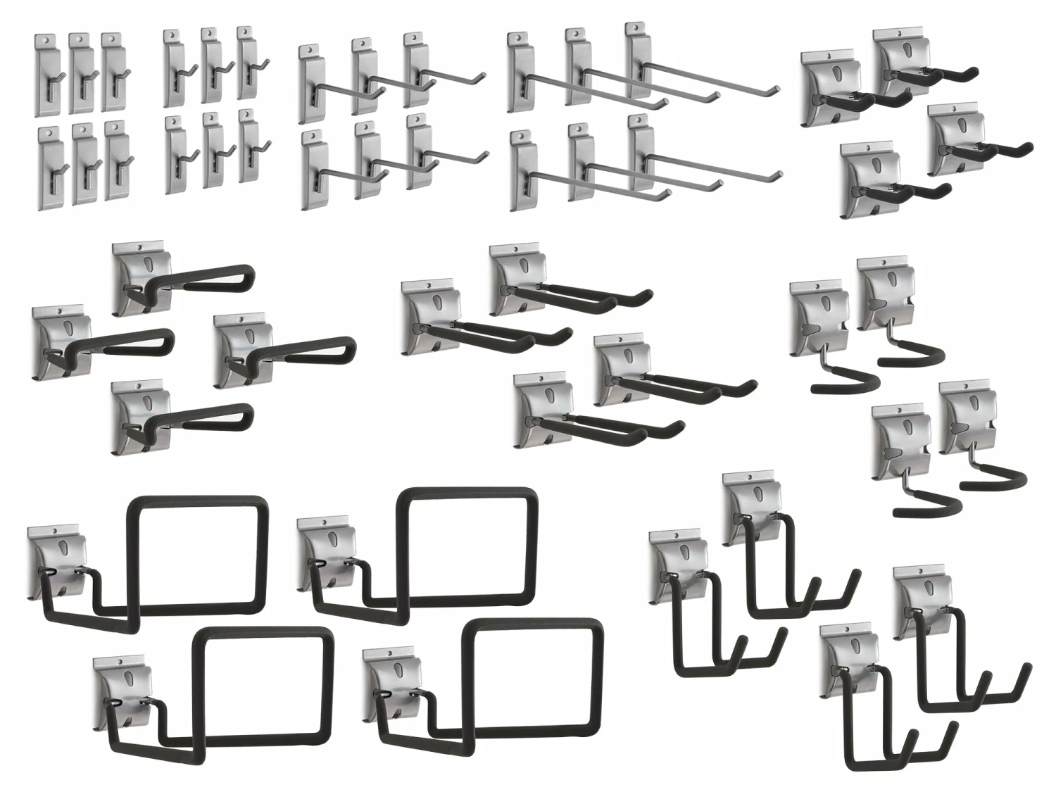 Maximize your slatwall solution with a variety of hooks to get your space organized. Designed for use with the NewAge Products Steel Slatwall and PVC Slatwall options, and compatible with most 3 in. on-center slatwall systems, the NewAge Products Universal Slatwall Hook Kit includes everything you need for storing your gear from gardening tools, sports equipment, and other household items. The extra strong steel hooks keep your smaller items like helmets and tennis racquets organized, while the Double Hooks are perfect for getting rakes, oars, and shovels off the ground. Store extension cords and hoses on the Loop Hooks and Deep Utility Hooks. The J Hooks are ideal for holding chainsaws, leaf blowers, trimmers, and other large bulky items. The Vertical Bike Hooks make it easy to wall hang your bicycles, for a cleared floor space. Turn your slatwall system into the ultimate storage hub with the Universal Slatwall Hook Kit.