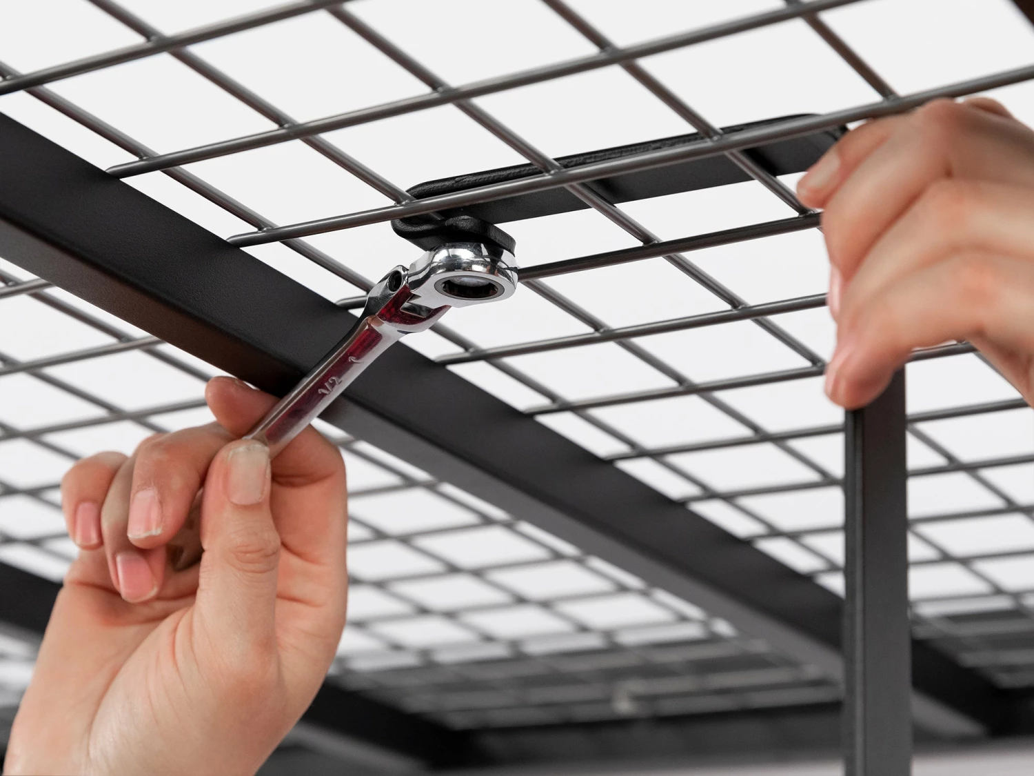 Take your storage system to greater heights with the NewAge Products VersaRac Pro. The heavy-duty steel overhead rack with double-layered wire grids can support up to 800 lbs. of bulky items, bins, seasonal décor and sports equipment, allowing you to free up valuable garage floor space. With built-in safety features such as the diagonal support bracket for added stability and the 1.5 inch safety lip to prevent gear from sliding off, you can park your car underneath it with confidence. The VersaRac Pro can be mounted to wood or wood engineered joists, and the 30-inch long mounting brackets make it easy to install even with irregular joist spacing. The ceiling mounted rack is height adjustable from 18 to 42 inches, so you can take full advantage of the storage potential of your space while clearing obstacles like garage door rails, doorways, and windows. Unlike other racks, the VersaRac Pro allows you to connect multiple racks either side-by-side, or vertically in a stacked formation. Create a truly unique off-the-floor storage solution with compatible NewAge VersaRac Accessories including Post Mount Hooks, Multi-Purpose Hooks, and Hanging Bars (sold separately). The durable powder-coat paint finish matches perfectly with NewAge Products Pro and Bold Series Cabinet black frames. Elevate the storage potential of your garage with the VersaRac Pro.