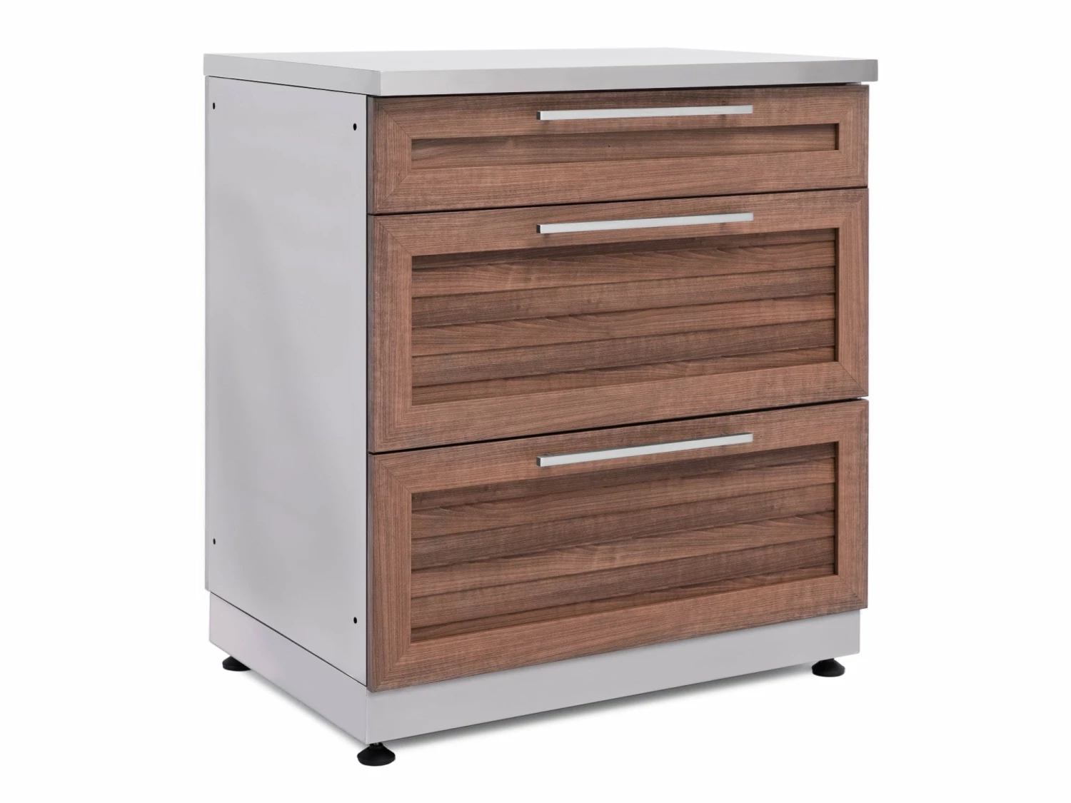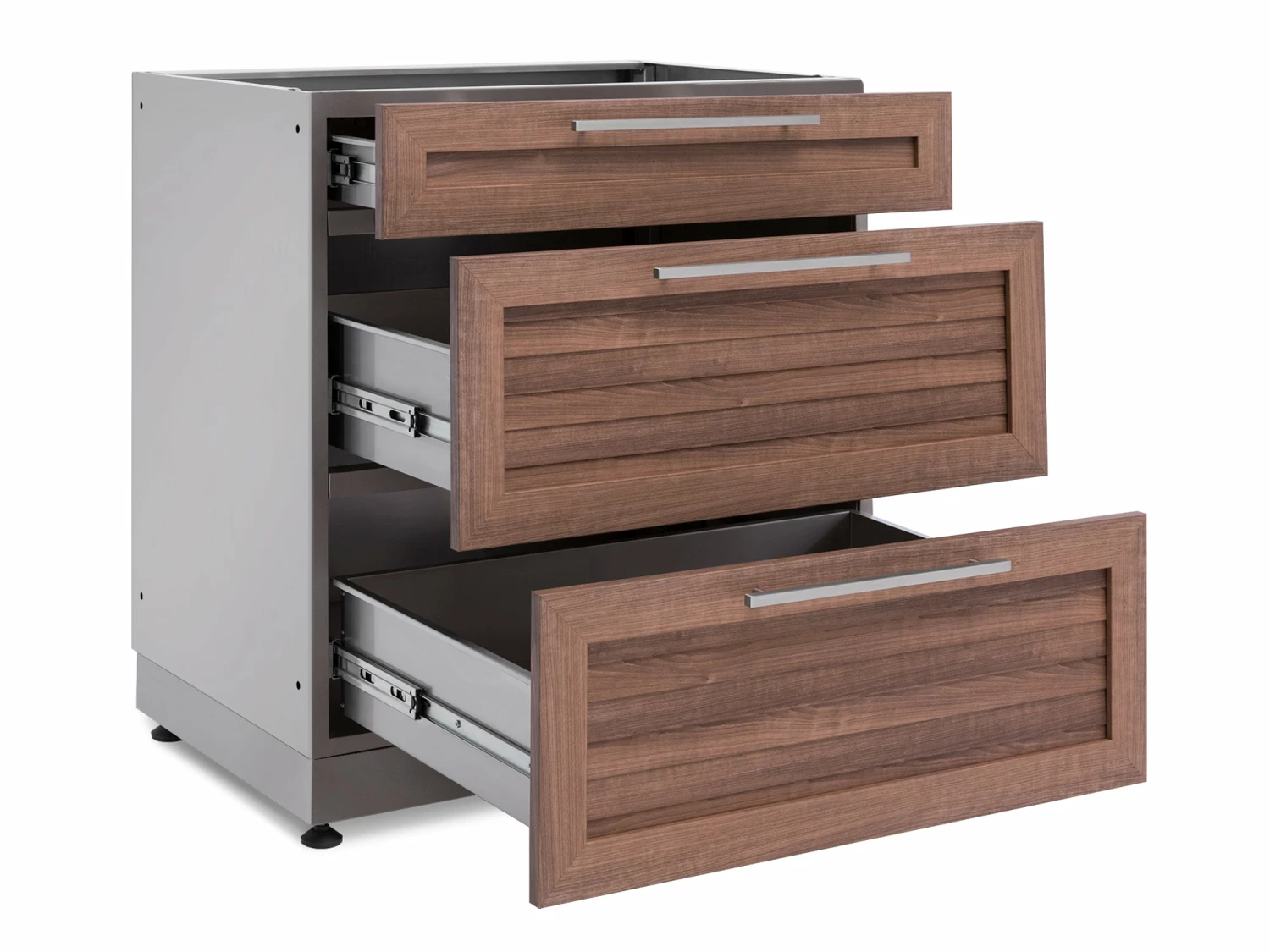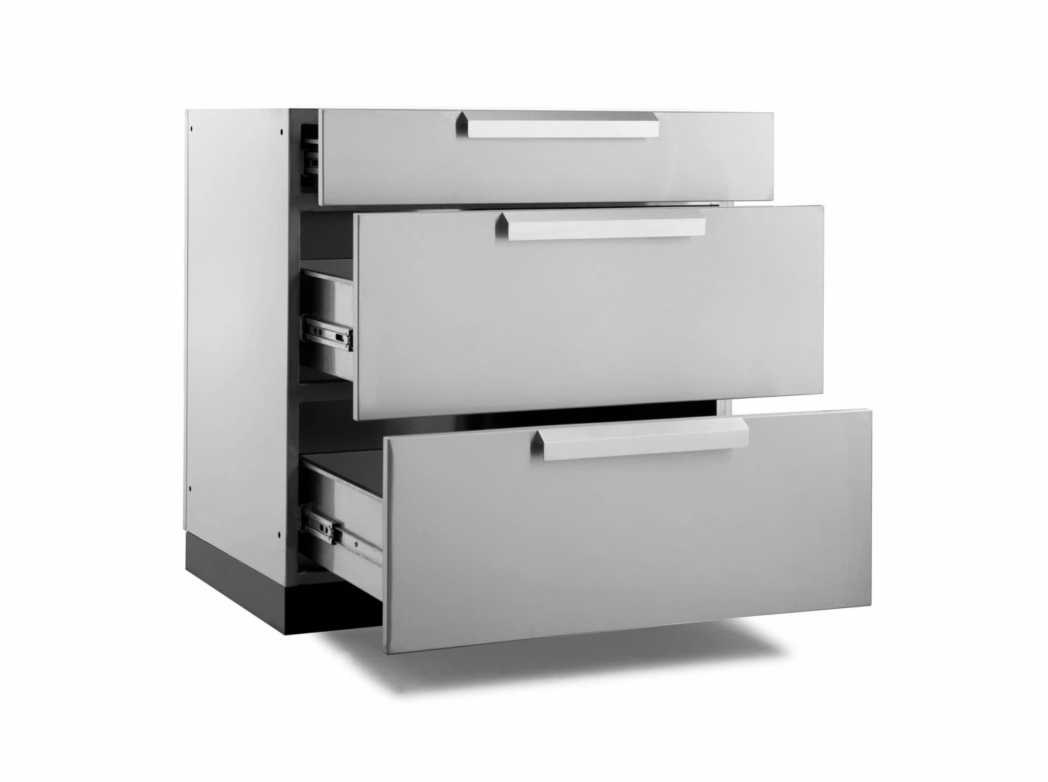 The Outdoor Kitchen 3-Drawer Cabinet gives you the convenient storage space you need for organizing hosting supplies, games and toys, and serving utensils. The fully assembled cabinet is built with 304 stainless steel for supporting heavy weights, and can easily handle stacks of dishes, bags of charcoal for grilling, and anything else you can throw at it. Two extra deep drawers, on soft-close drawer slides, smoothly open to full-extension for completely accessible space, and easy-grip handles provide quick drawer access even when your hands are full. The top drawer includes adjustable stainless steel dividers for separating cutlery and utensils, and easily organizing small items like skewers and BBQ lighters. For the convenience of a stocked kitchen, right in your backyard, the NewAge Products 3-Drawer Cabinet is your ultimate storage solution.
