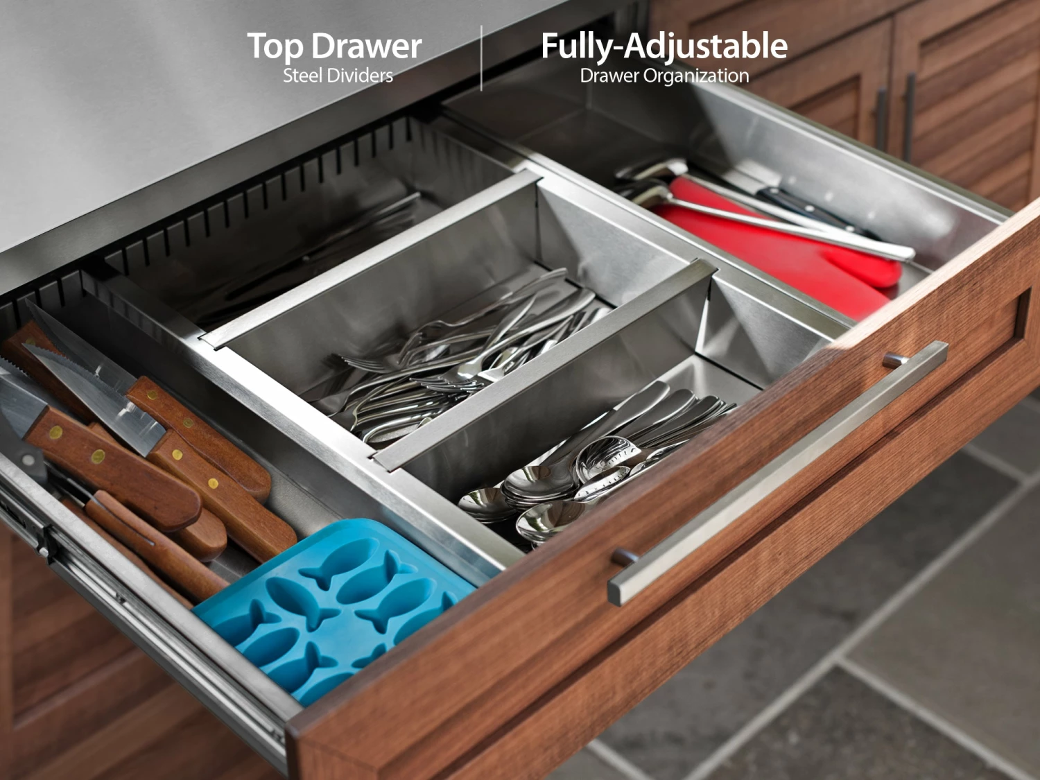- Full extension multi-depth drawers offer storage for items of different sizes