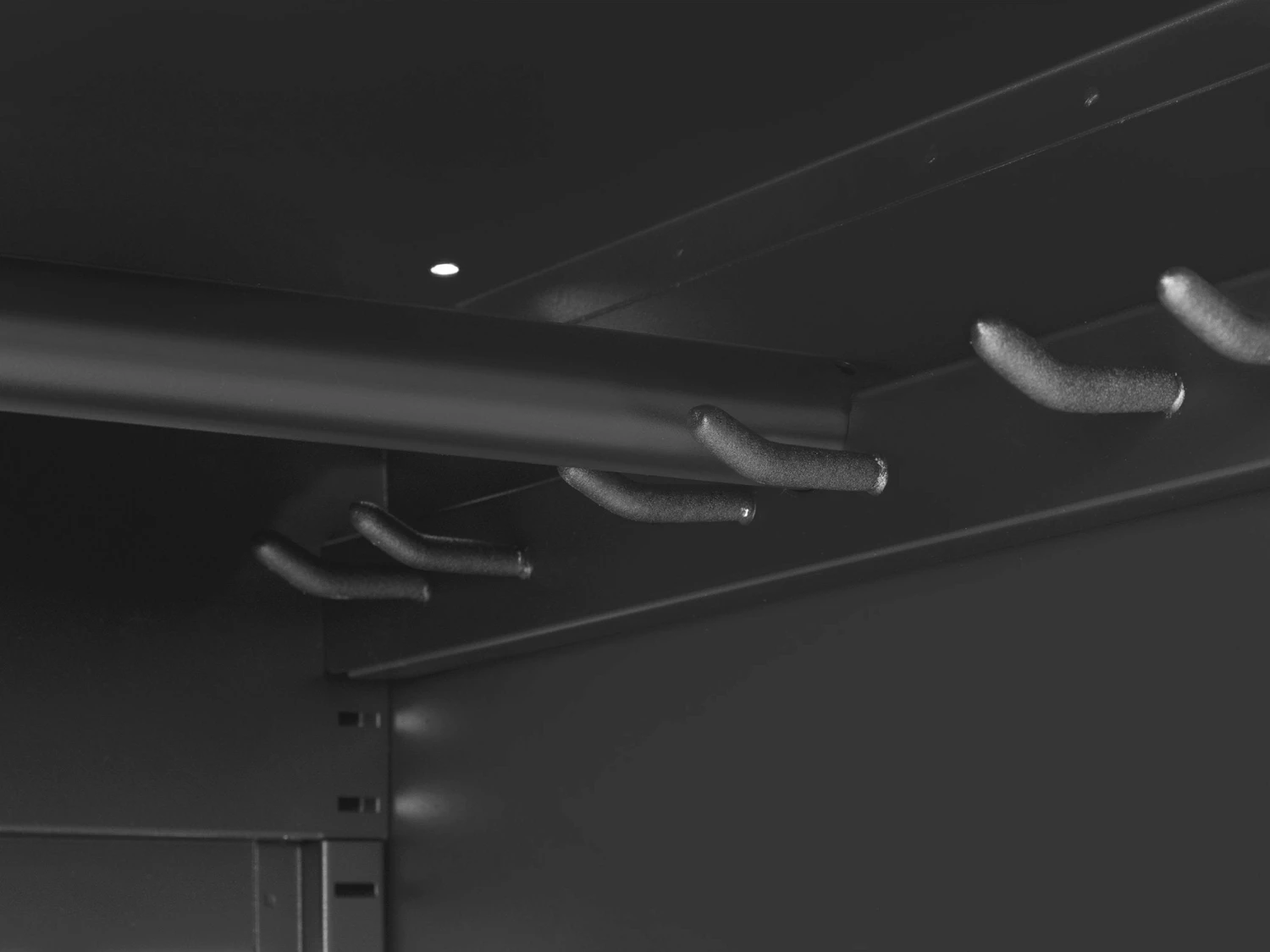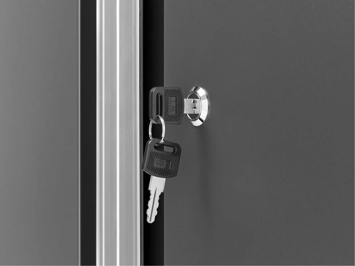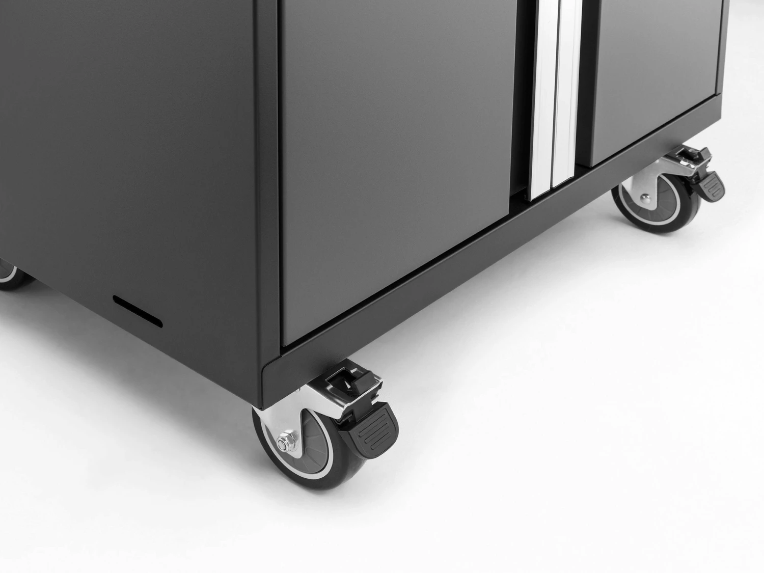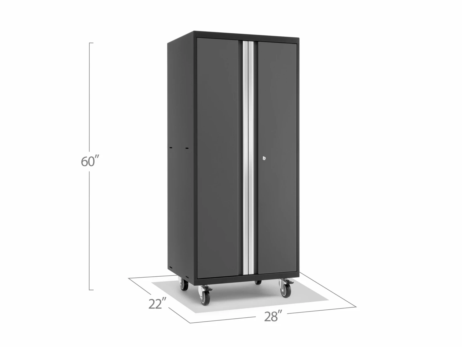 When you need plenty of storage space, with the portability of casters, the Mobile Locker gives you the on-the-move organization to store all of your large tools and belongings. The welded steel frame supports up to 1,000 pounds of stored weight, with sturdy double wall doors on premium soft-close hinges for stability. Movable storage lets you position your locker out of the way of vehicles, or to make the most of a smaller space. Store your car cleaning kit, kids toys or power tools behind the lockable doors with integrated aluminum handles, and easily wheel it out to your driveway on smooth gliding 4 in. swivel casters. Two front casters include quick-lock step brakes to keep your locker securely held in place. The two full-width steel shelves are adjustable in 1 in. increments, giving you a customizable storage space to fit your large tools, like a wet/dry vac, with a cable management cutout on the locker floor for routing power straight into the locker. An industrial Sandtex paint finish protects the cabinet exterior, and integrated aluminum handles provide quick access to the locker contents. An included removable closet rod turns your locker into a storage unit for seasonal outerwear, with multi-peg hooks for hanging storage.
