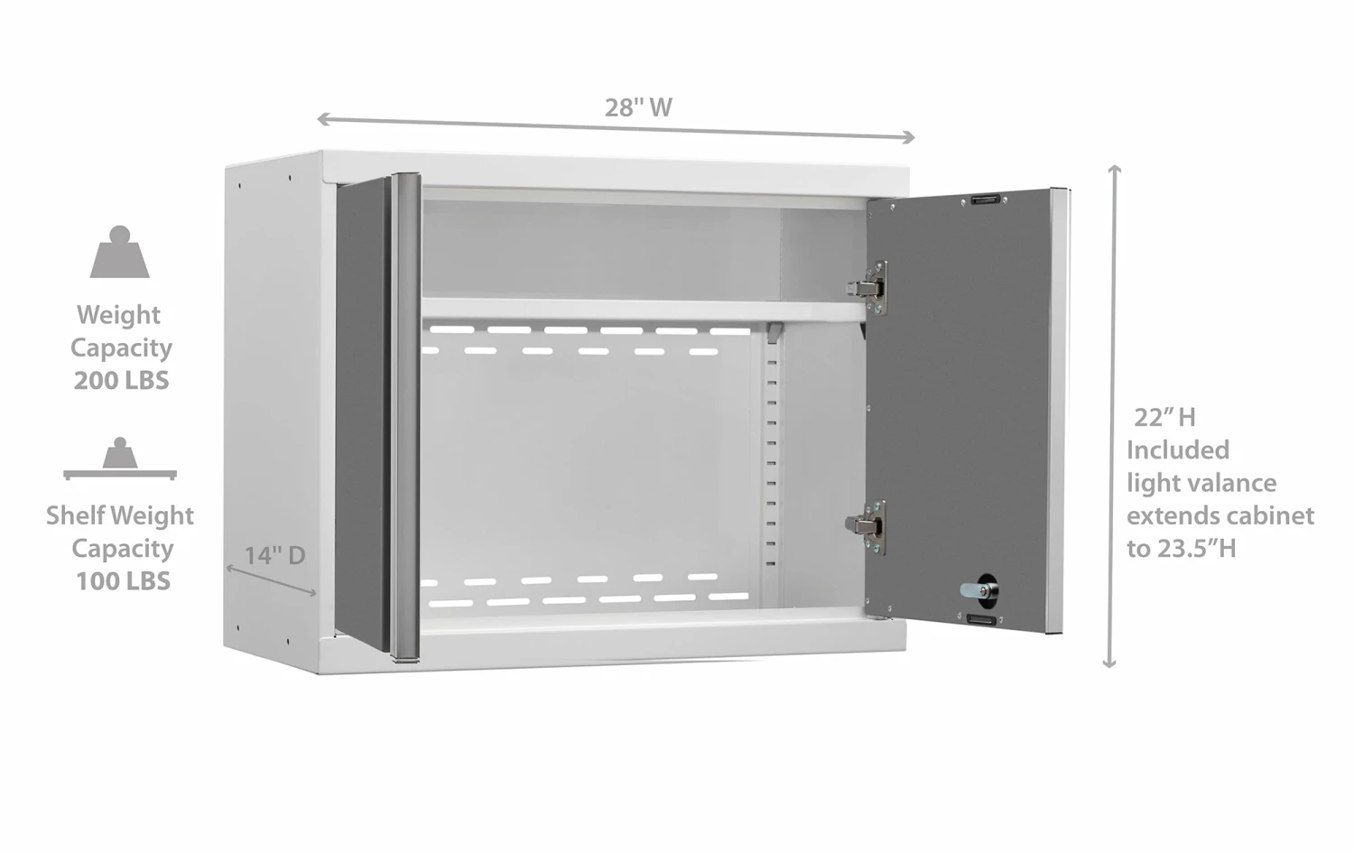 The Pro Series Wall Cabinet was designed to get your gear up and off the ground, allowing you to make the most of your space. Its durable powder-coat paint finish works to prevent scratching, while the included valance allows you to hide optional LED lights and unsightly cables. Arriving fully-welded, the Wall Cabinet only requires minimal installation, before it is ready to store your stuff.